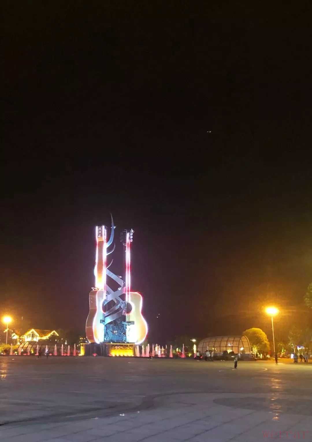 “那天姚晨在这里给大鹏打了个电话,给他看广场上的吉他,说电影《缝纫机乐队》里的吉他广场原来在这里。”