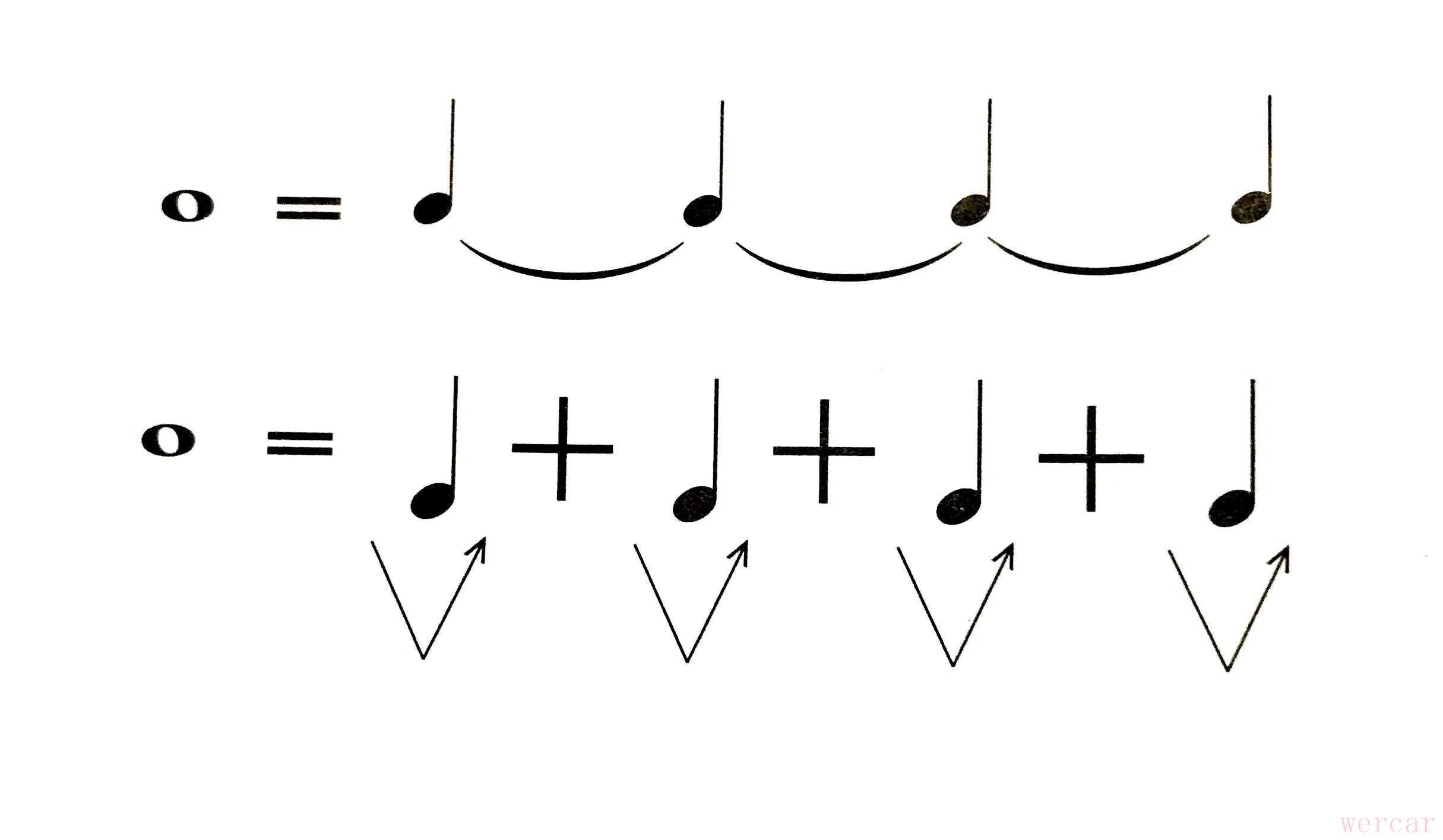 全音符的时值为4拍,由一个空心的符头构成。一个全音符跨越4拍,在读拍子时可以读成跨越4拍的一个音“大”,也可以读成“大、啊、啊、啊”4个音,用3个“啊”音作为第一个“大”音的延音,这样可以很好地理解一个音跨越拍子的时值存在,但是在音效上仍然是1个音。1个全音符的时值相当于4个四分音符时值的总和,在4/4拍中1个全音符的时值占满1小节。