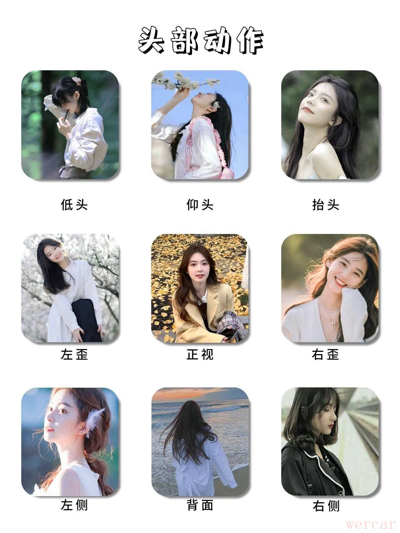 拍照不知道头部动作怎么摆的女生们,可以试下下面这些头部动作,比如低头、仰头,抬头,向左歪头、直视镜头、向右歪头、左侧侧颜、背面、右侧歪头、回头微笑等动作,搭配肢体和表情,好看又上镜,女生学起来,男生教对象这么摆。