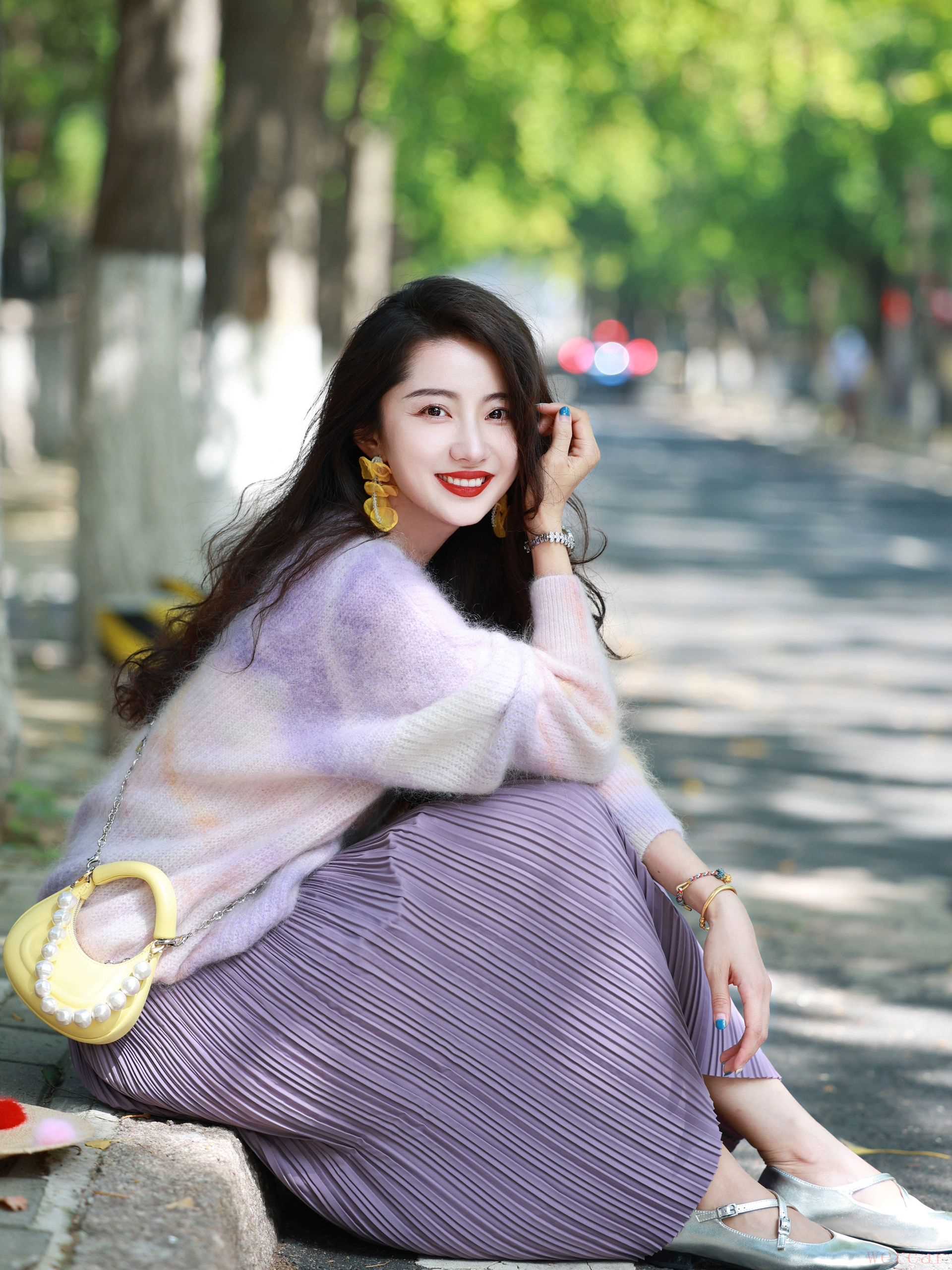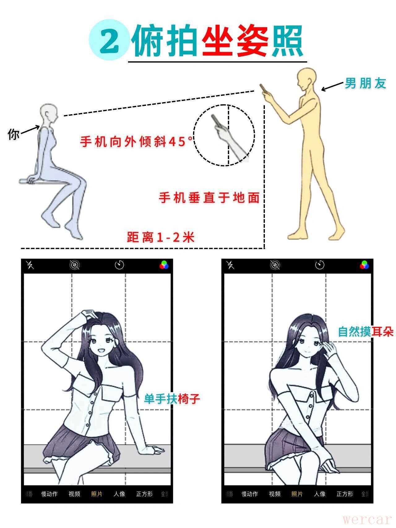 给对象拍坐姿照的时候,可以尽量采用俯拍的姿势,距离女朋友1-2米的位置拍,手机垂直于地面向外倾斜45度,这样俯拍的角度就有了,会比较显脸小。