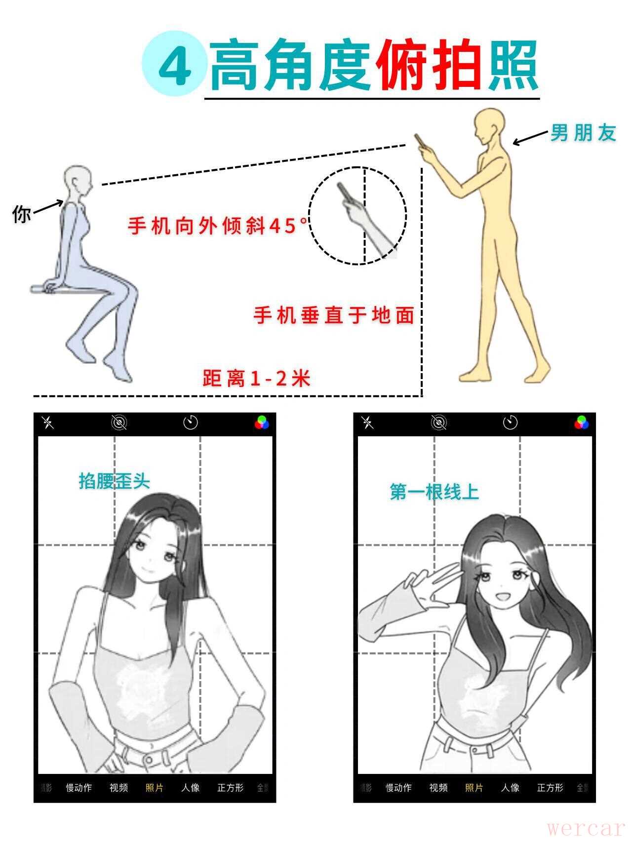 拍女朋友的时候,可以多用俯拍,因为这样可以避免双下巴,把对象拍得瘦,所以,拍照的时候,可以在距离对象1到2米的距离拍,让对象坐着,或者你站在比较高的地方,收集向外倾斜45度向下拍,这样就能拍出高角度的俯拍好看照片啦。