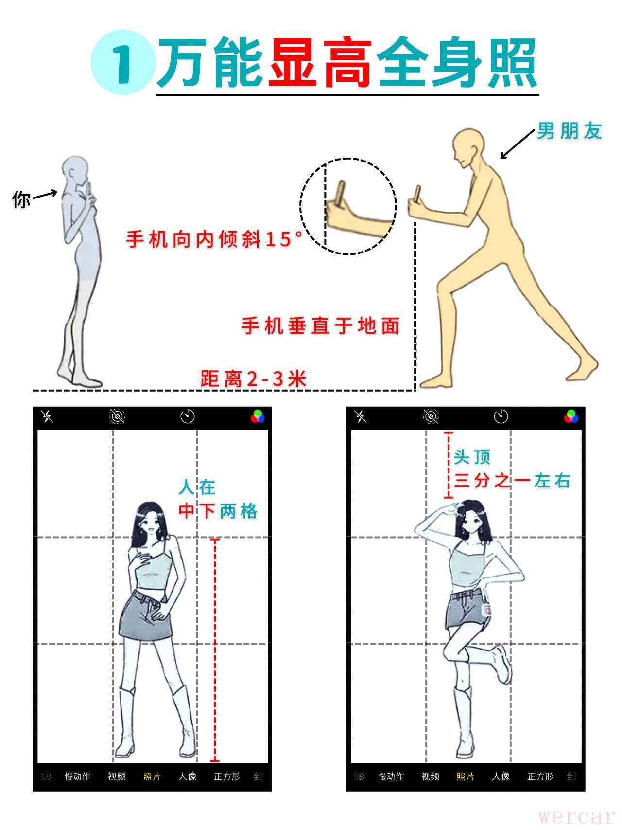 拍全身照的收获后,尽量距离在对象2-3米的地方拍,手垂直于地面,向内倾斜15度左右,给人一种稍微仰拍的感觉。