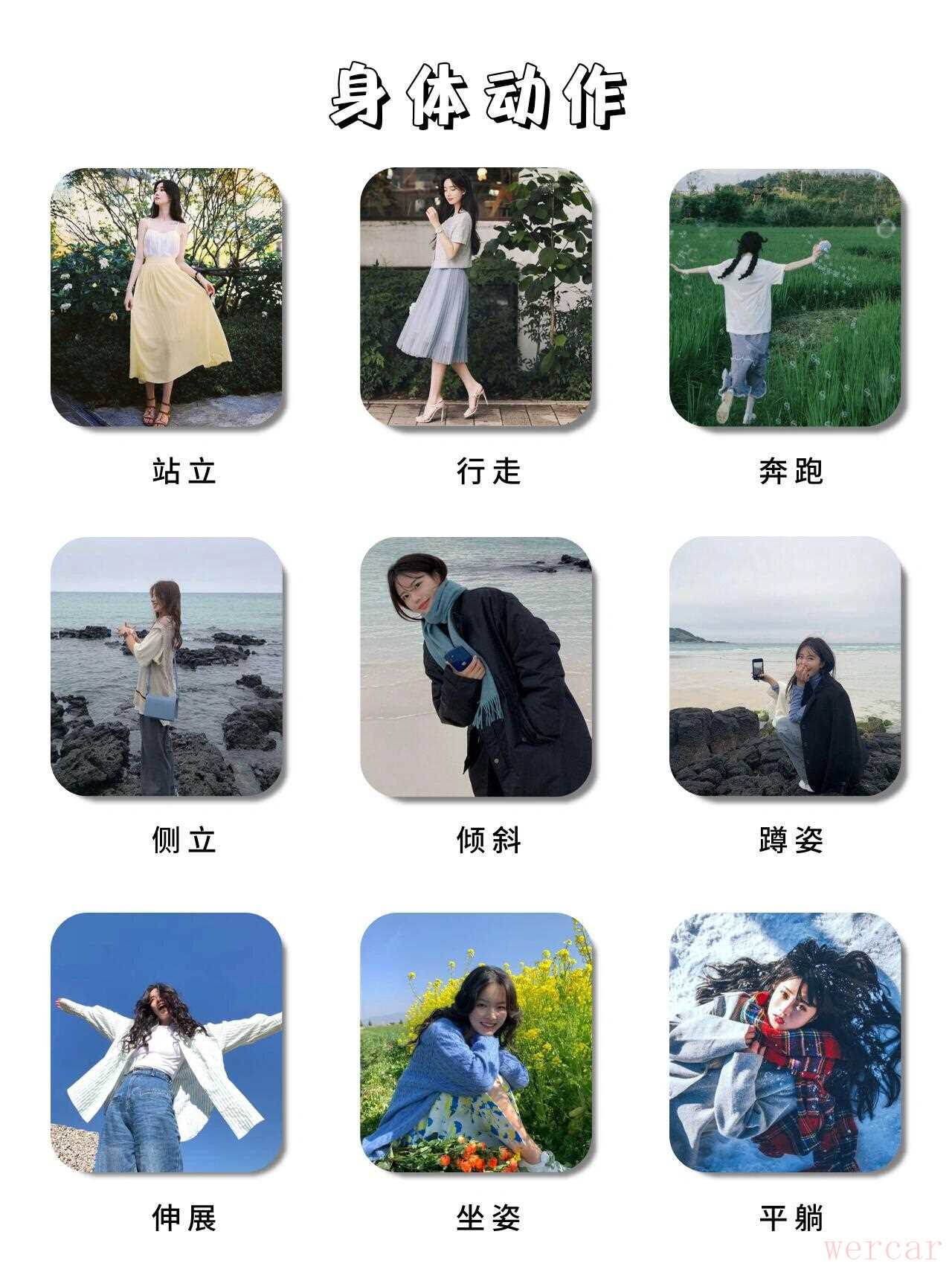 拍照的时候,肢体的动作也是关键,可以摆拍一些站立、自然行走、奔跑抓拍、侧身站立、弯腰倾斜、侧身蹲姿、伸展双手、侧身坐姿、平躺姿势等,这样可以让身体动作更加自然,拍出来的照片也就不坚硬呆板,很自然好看啦!
