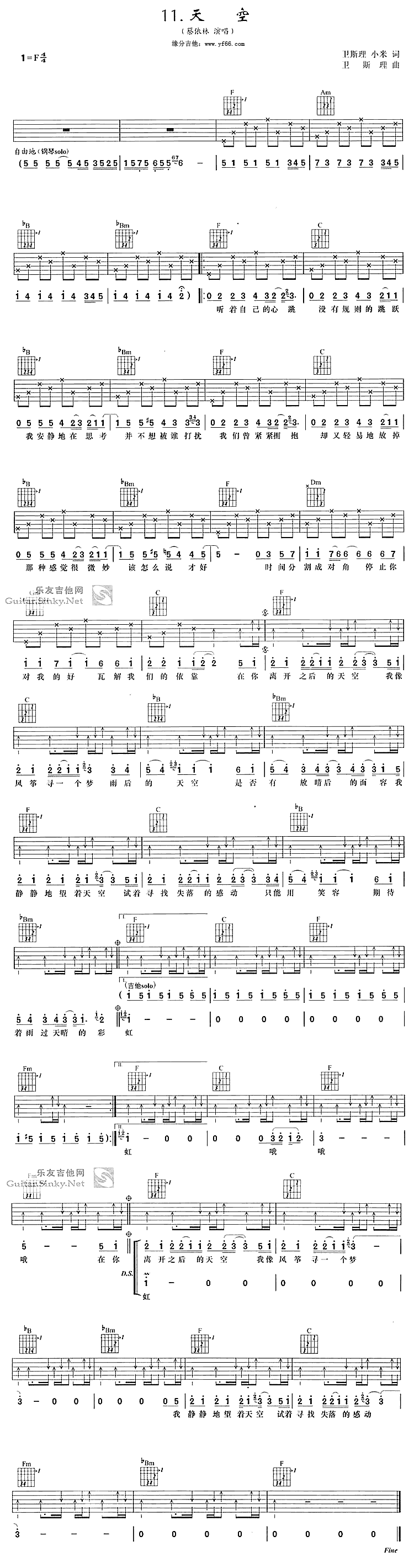 5. "情感表达":蔡依林的《天空》是一首充满情感的歌曲,吉他弹唱时要注意情感的传达,让听众感受到歌曲的意境。