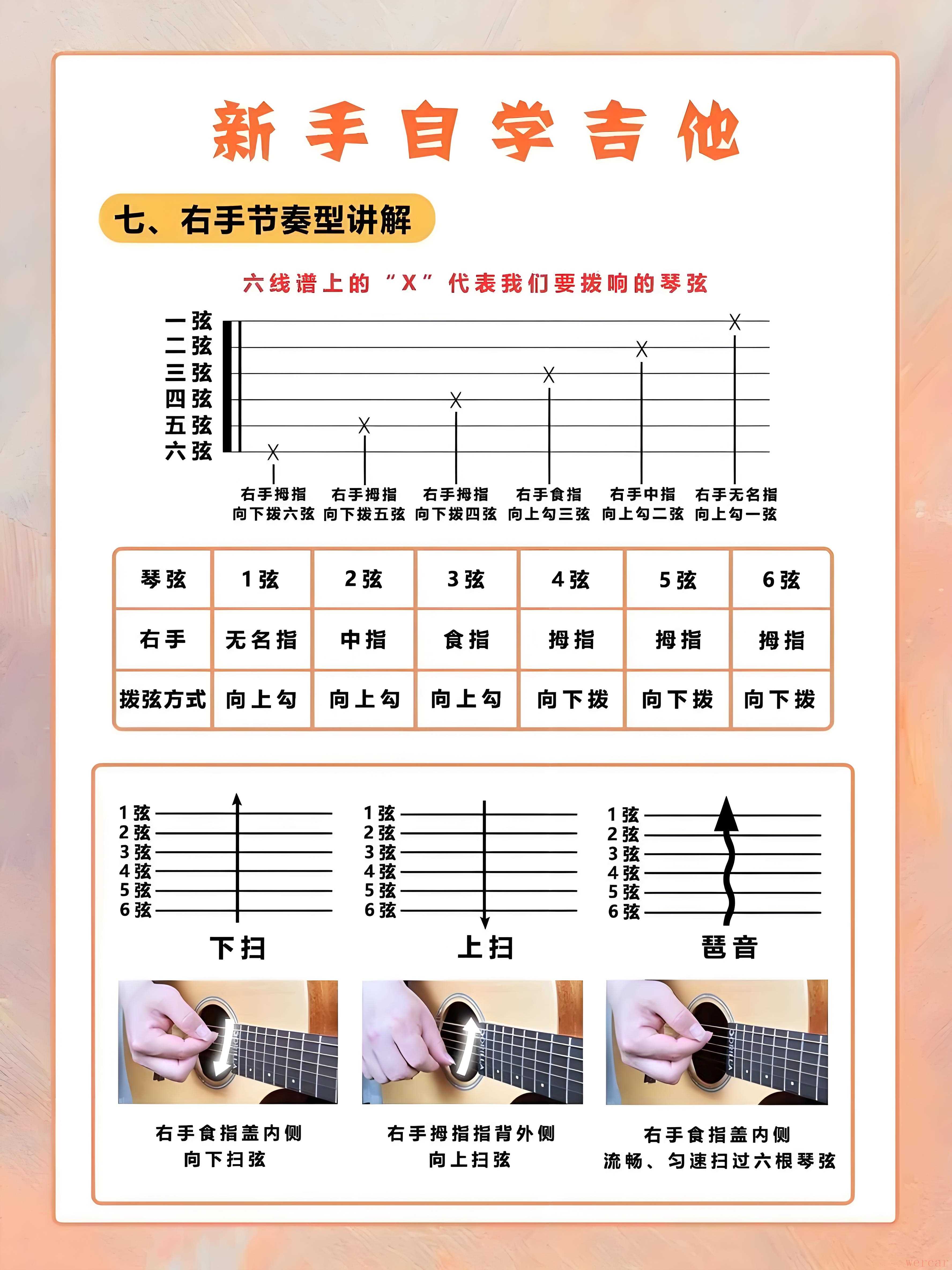 6• 扫弦整齐划一:从简单节奏“下、下、上、上、下”开始,用拨片或手指扫弦,控制力度和范围,让声音整齐和谐。先慢练感受节奏和力度,再加快速度,有杂音就调整。