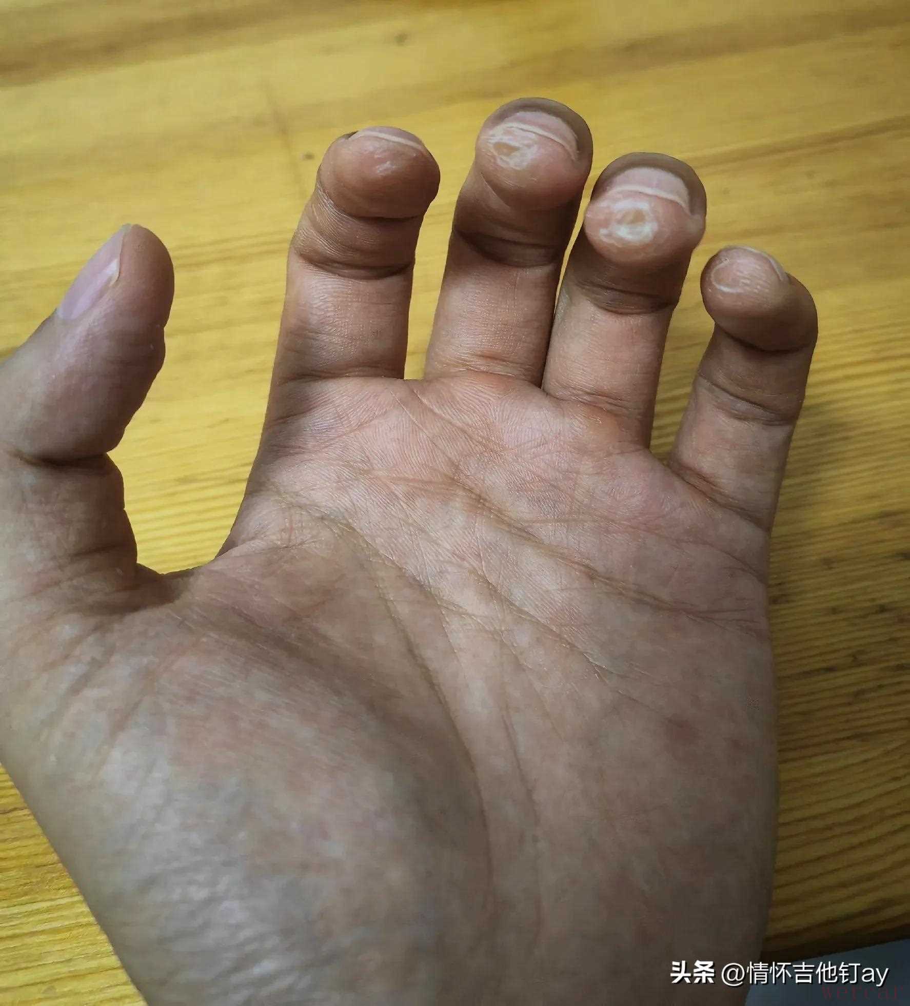 大家请看我的手指照片,今天看着自己的手指,突然就很感慨,以前总是怀疑自己练不成吉他,现在想想,其实根本就是功夫没有下到!