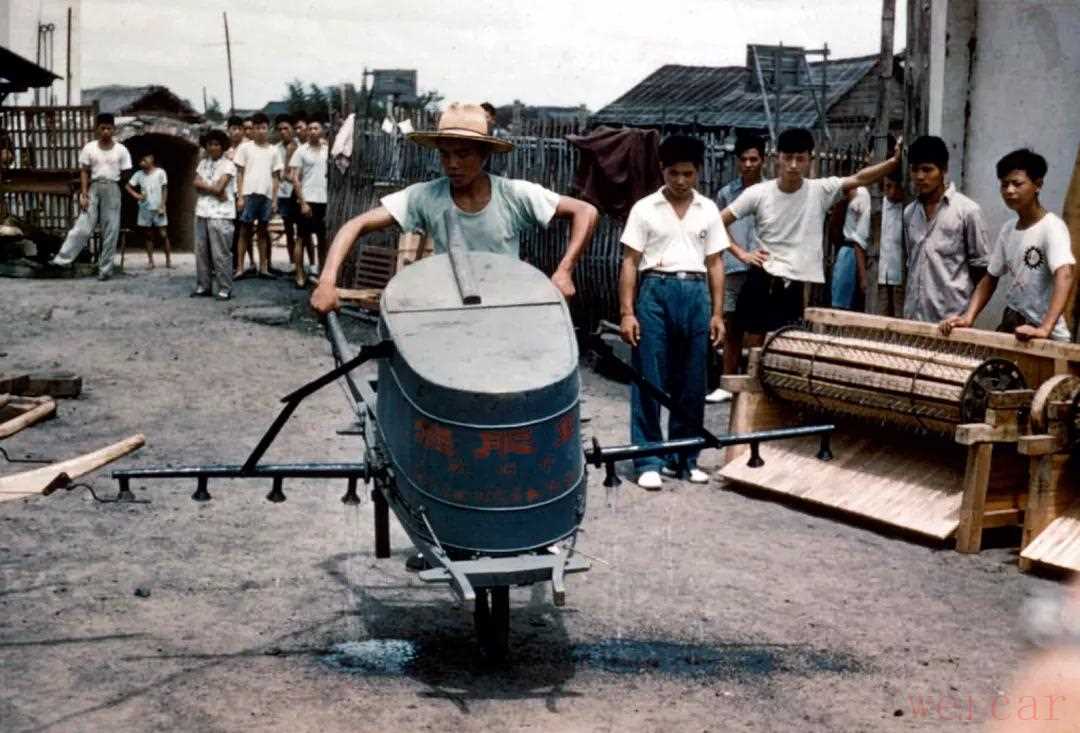 20世纪60年代,在浙江省杭州市郊的农村,一群年轻人正在围观农业合作社当时新打造的“施肥车”。