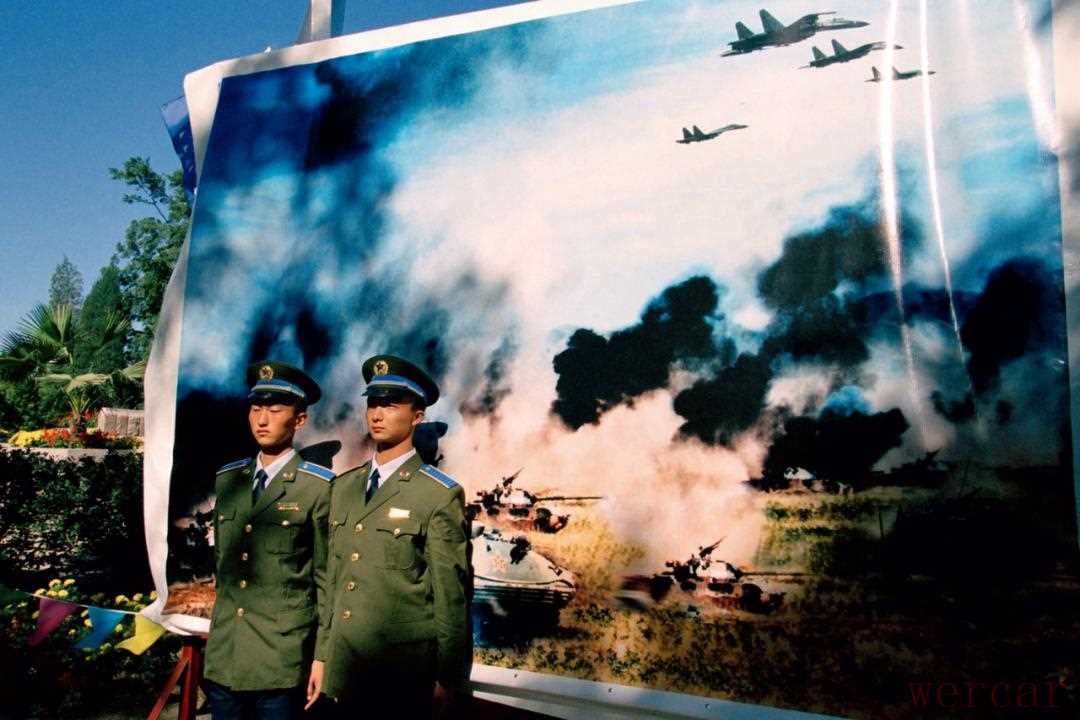 1999年,10月2日,为庆祝新中国成立50周年,在北京某公园举行的军事展览上,两名军校学员在军事演习的巨幅海报前留影。