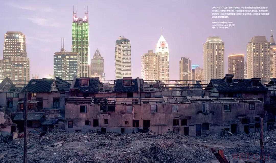 2002年,9月,上海,夜幕即将降临,中心城区老旧的连排楼房正被拆除,远处是灯火通明的高楼大厦。