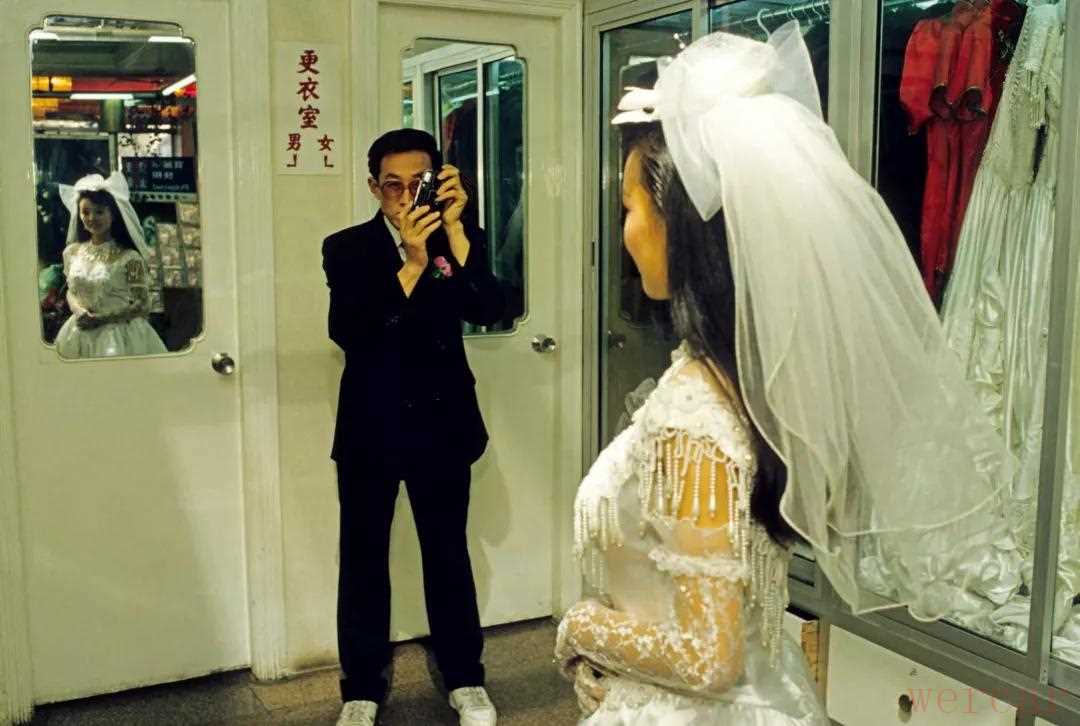 1995年,一位男士正在为自己的未婚妻拍摄婚纱试妆照。