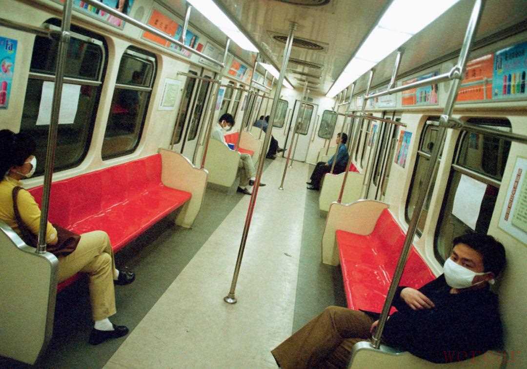 2003年,5月2日,由于“非典”疫情,昔日人满为患的北京地铁里,只有寥寥几个戴着口罩的乘客坐在反复消毒的座位上。