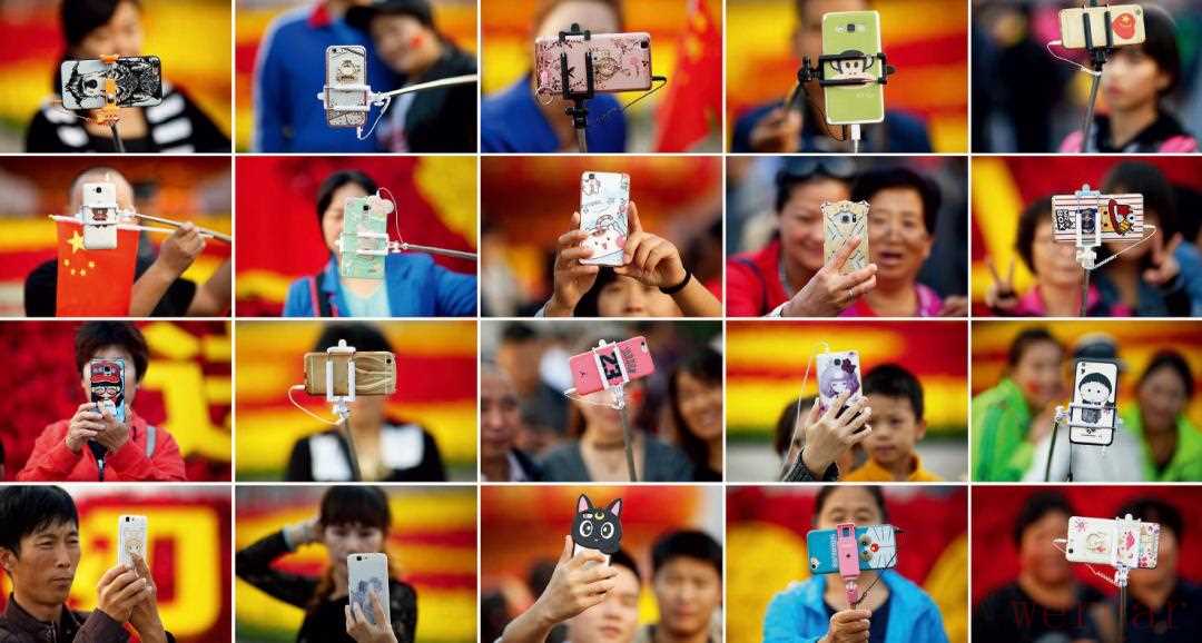 2016年,10月1日,路透社摄影记者达米尔·萨戈里将镜头对准了那些在北京天安门广场用手机自拍的中国游客。自拍杆与美颜App的组合成为旅行者的标配,手机壳也成为彰显个性的物件。