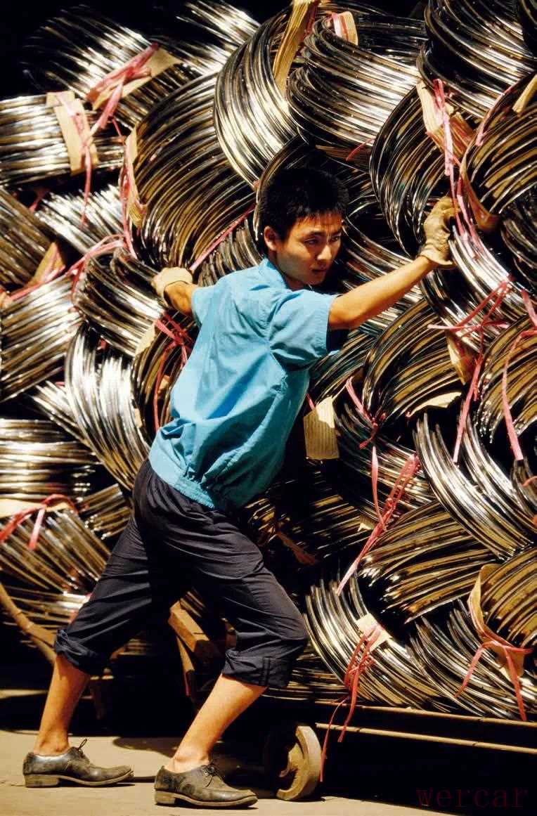 1993年,6月,上海,凤凰自行车工厂的一名工人正独自推动着满满一车的轮圈。20世纪八九十年代,中国还是自行车车轮上的国度,凤凰自行车在很多人心目中有着特殊的地位。