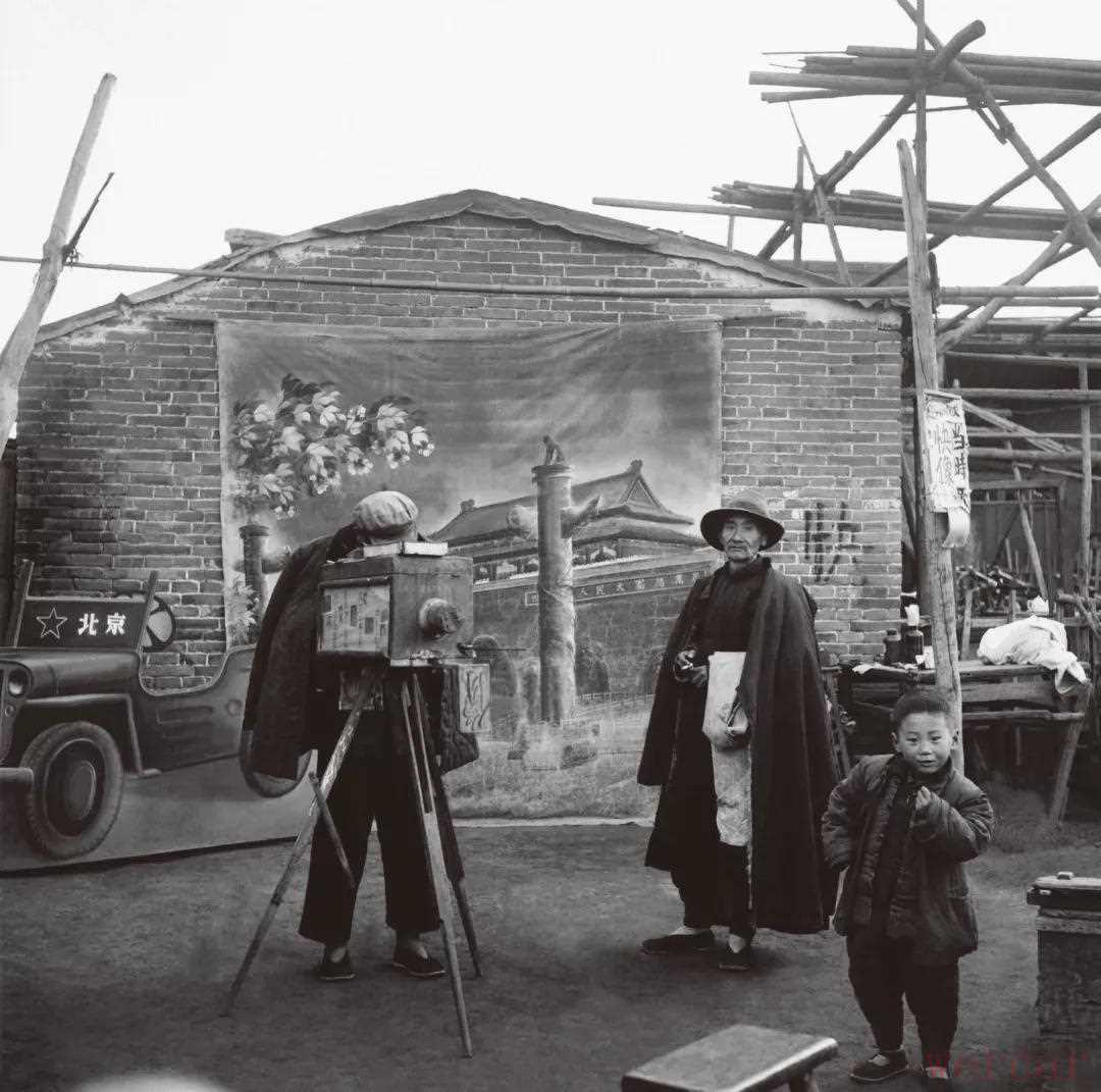 1955年,街头的“露天照相馆”里,一对祖孙正准备在印有天安门的背景布前留影。