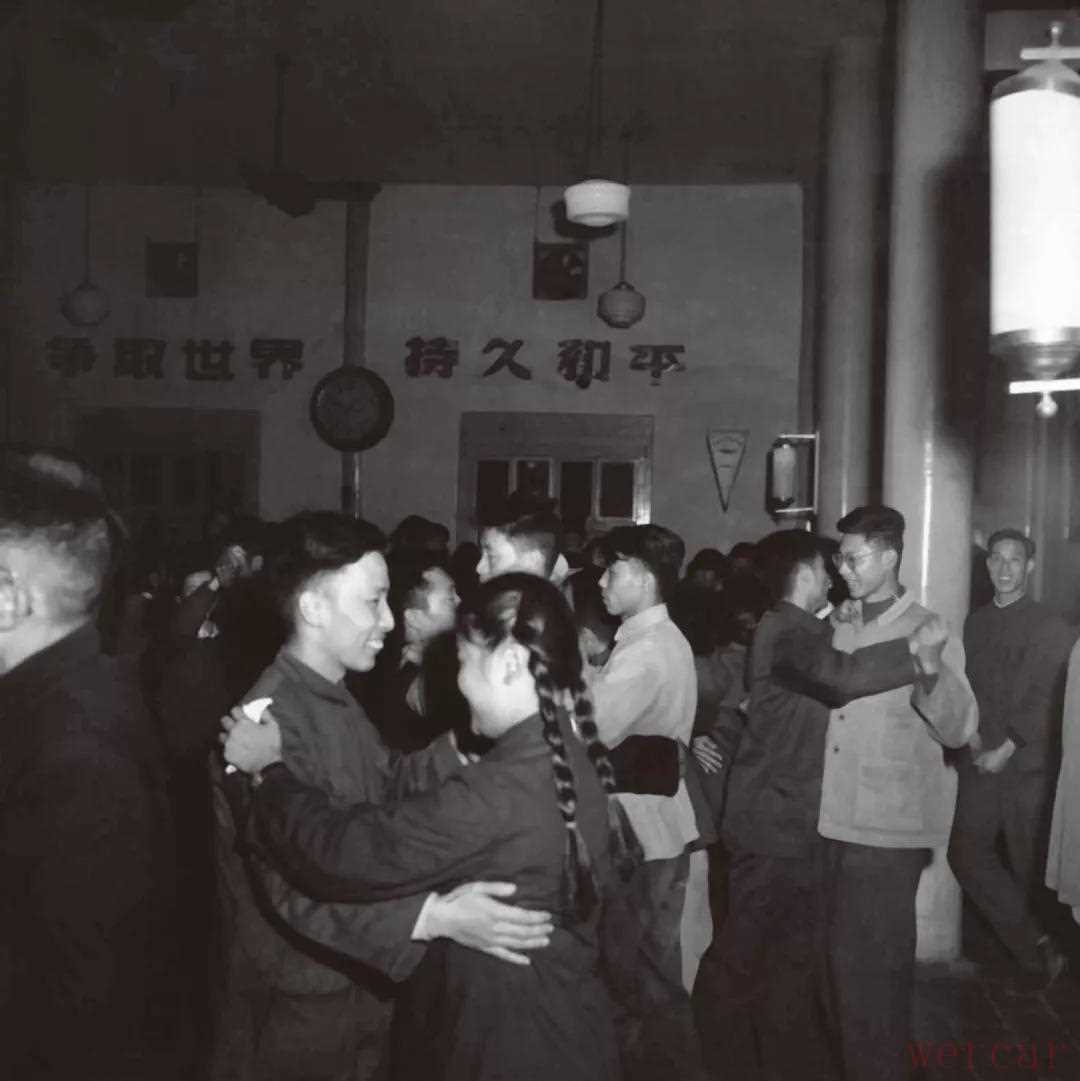 1954年,在一场由工会组织的职工舞会上,青年男女翩翩起舞。在当时,交谊舞是一种广受欢迎的休闲方式,很多人都会参与。