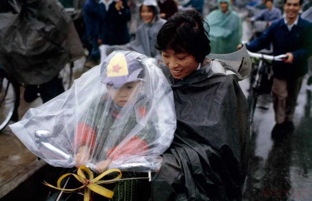 1977年,12月,雨中的广州街头,一位母亲用塑料布为孩子挡雨。那个年代的中国孩子大部分都有过坐在父母自行车前杠上的经历。