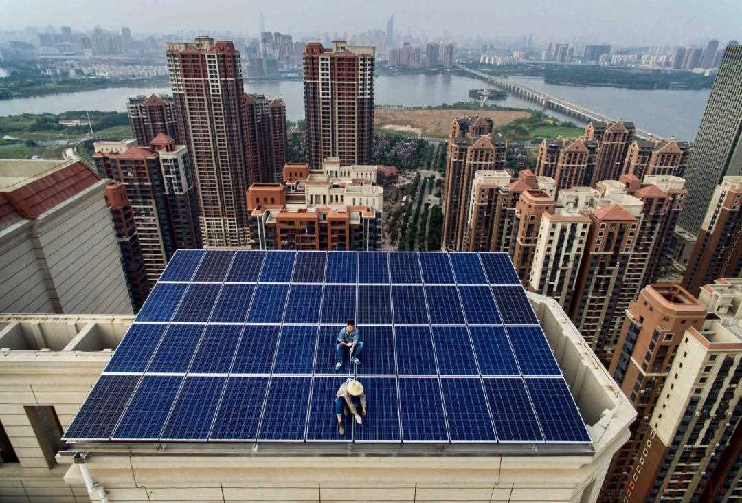 2017年,5月15日,湖北武汉,工人在一座47层高的大楼顶上的太阳能电池板上作业。随着环保意识的增强和国家政策的引导,清洁能源越来越多地用在城市建设中。