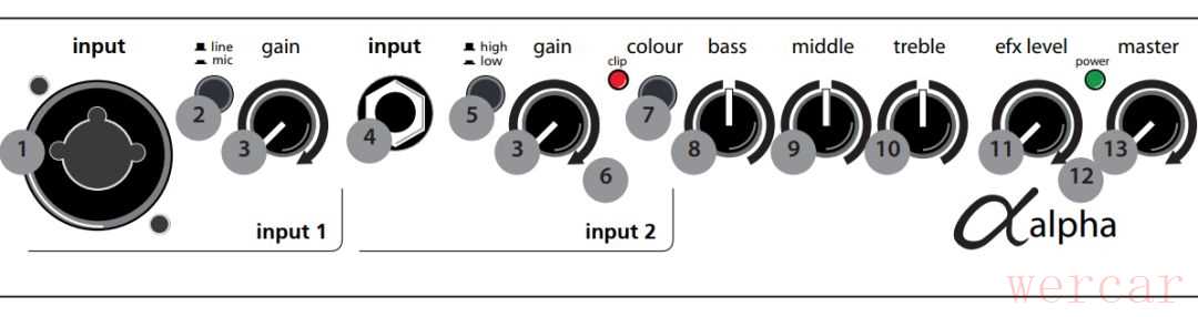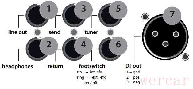 内置数字混响效果引擎,用efx level旋钮控制混响强度,外置效果器可接在效果回路中,其信号强度由相应的效果器控制,在背板的footswitch接口连接一个标准的双钉脚控就可以远程切换内置/外置效果;Line Out和DI Out输出都在音色线路之后,前者包含效果信号,后者不包含,灵活的输出选项为调音台工程师提供了更多混音空间;另有耳机输出(使用该接口时扬声器将静音)和调音表接口。
