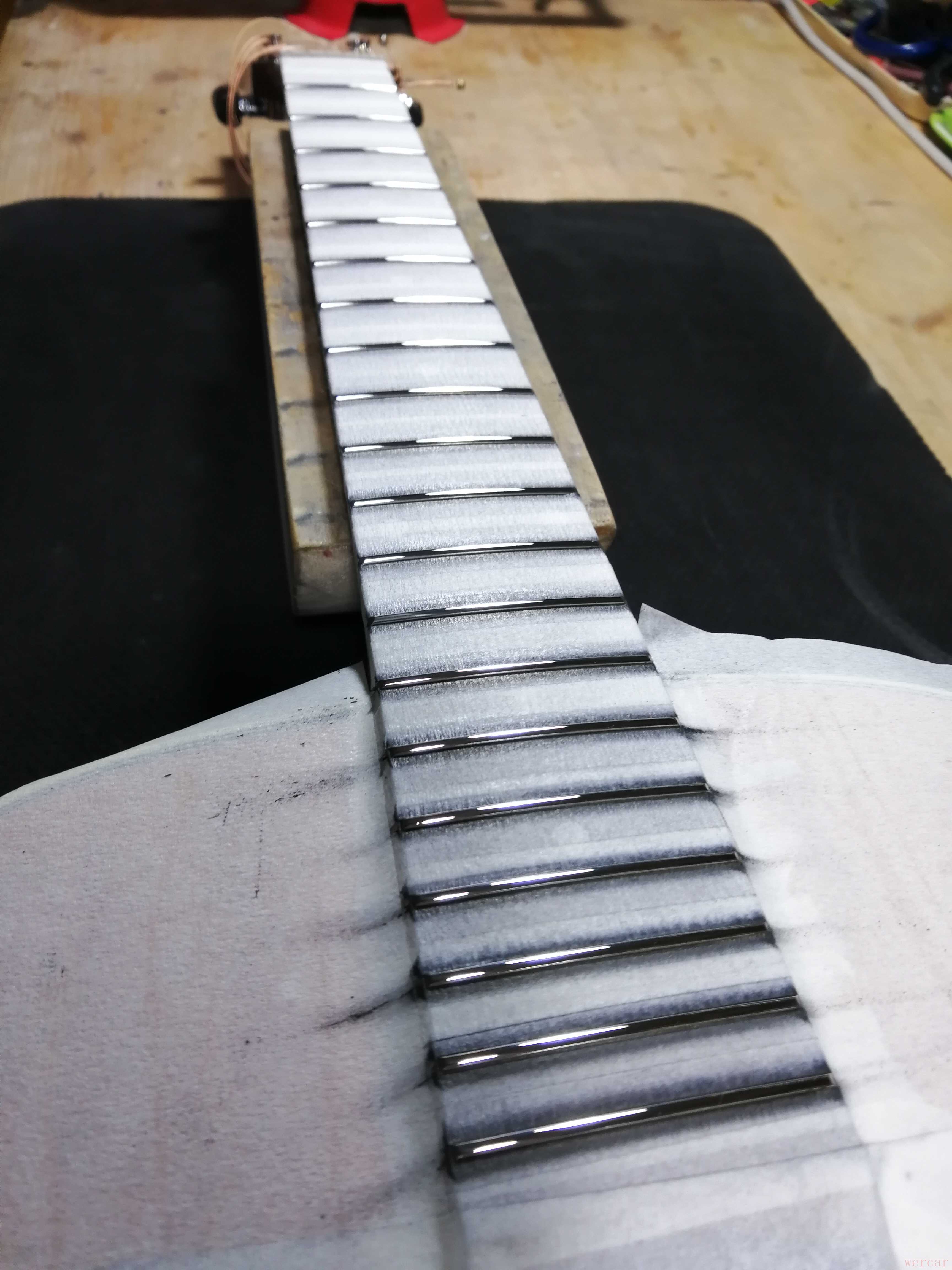 品丝的保养过程实际上就是去除氧化层提升光洁度的过程。吉他在制作过程中品丝表面会留下很多细小磨痕,而且这些痕迹是垂直于琴弦震动方向的,琴弦与品丝接触时很容易产生磨损,时间久了甚至形成凹坑,这样就不得不更换品丝了。
