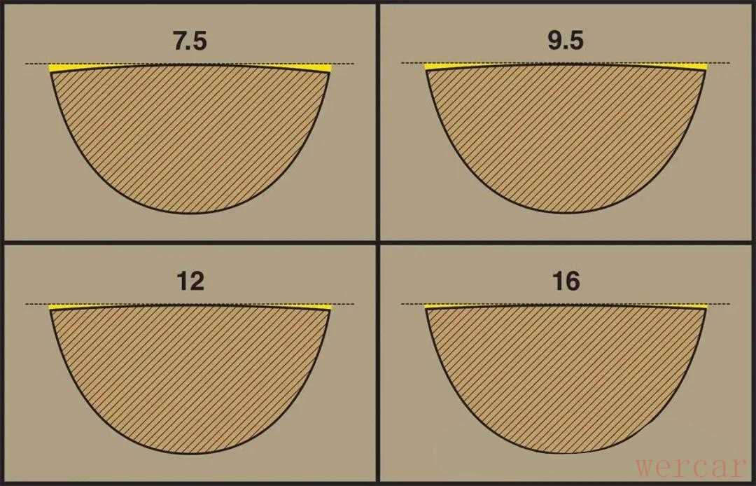 现实情况是,大多数常见的弧度在曲率上都非常接近。我们拿最常见的两个数值来对比:12 英寸和 16 英寸。