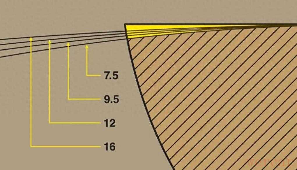 在标准声学吉他(上枕宽1.75英寸)的位置,12英寸弧度的指板中心到边缘的厚度差约为.032英寸;而16英寸的厚度差约为.024英寸。两者的净差只有.008英寸。