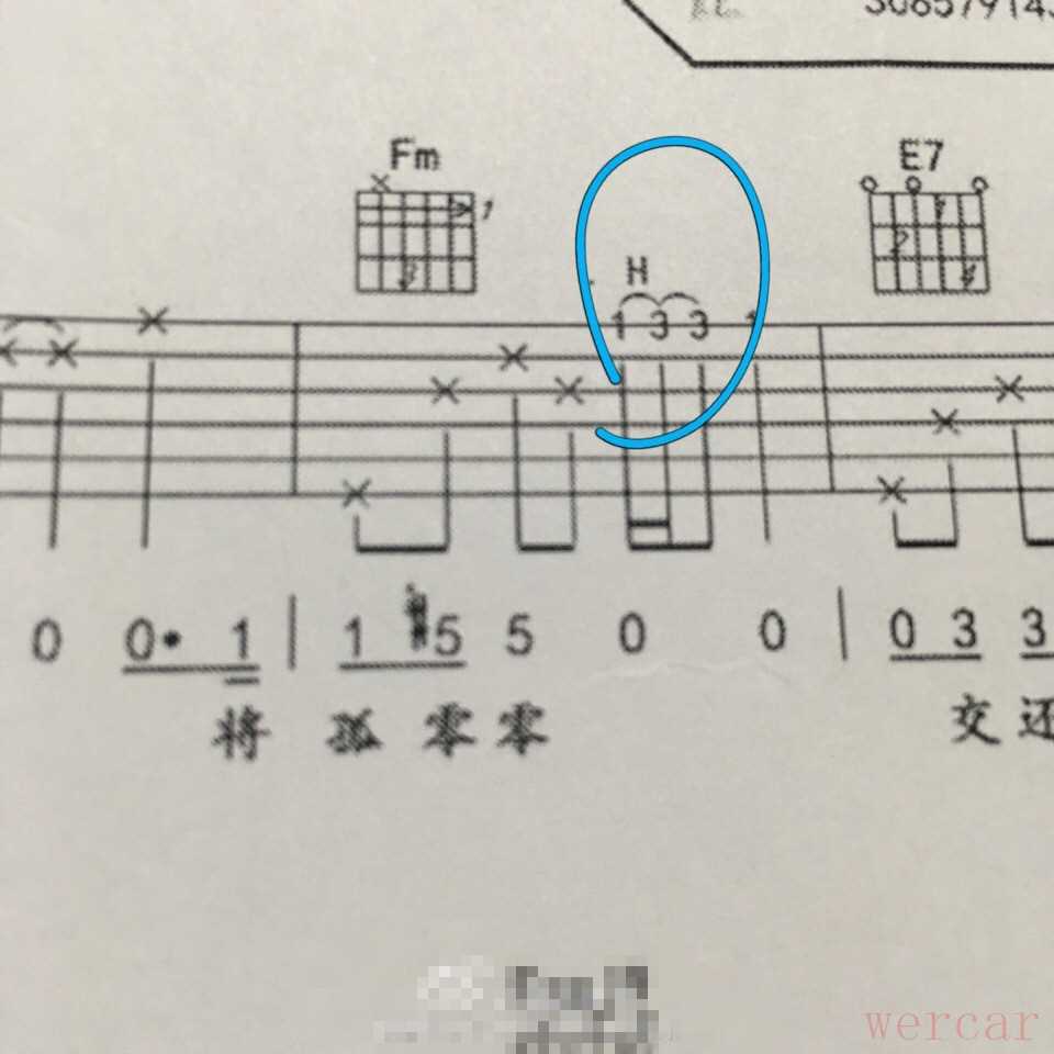 吉他谱上常常会看到这样一个符号(如图),H是英文hit的缩写,hit意为“打击”,这里代表的是吉他的一个演奏技巧:击弦。