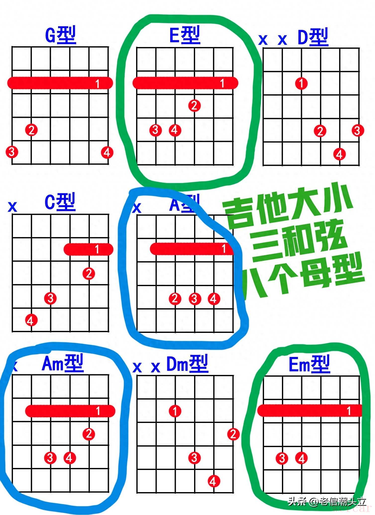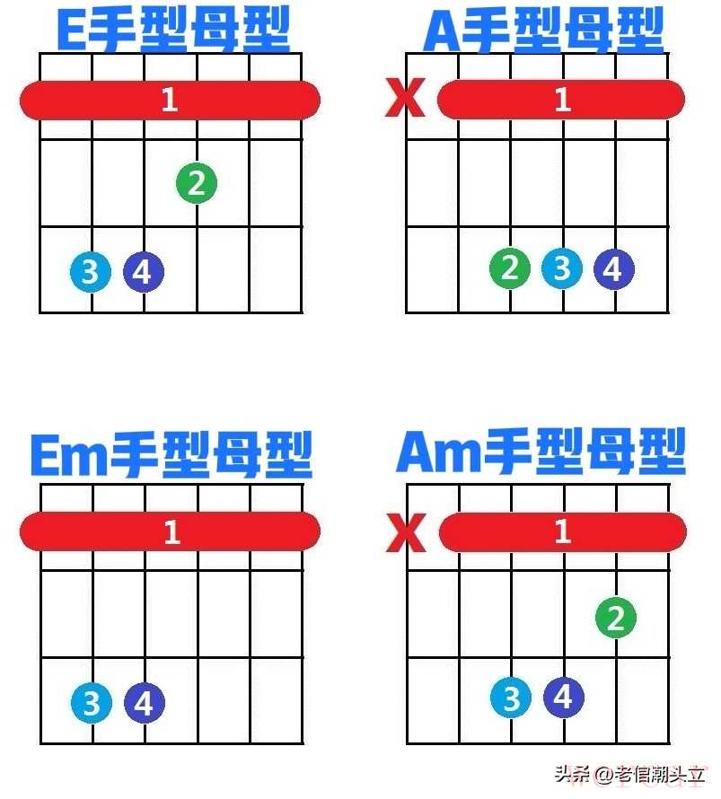 常用的母手型有8个,但新手不用全学,4个万能手型就足够覆盖绝大多数流行歌、民谣弹唱,分成两类,超好记: