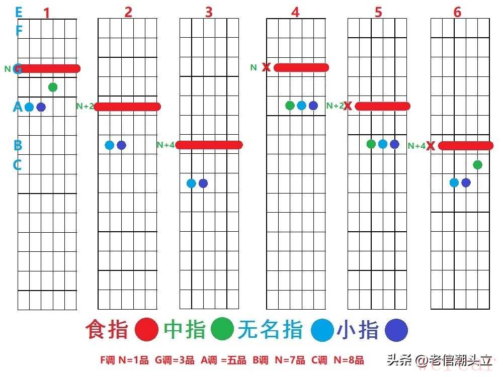 3. 尝试手型平移,从一品到三品、五品,慢慢挪动,感受“手型不变,和弦万变”的规律,边移边记根音,很快就能找到感觉;