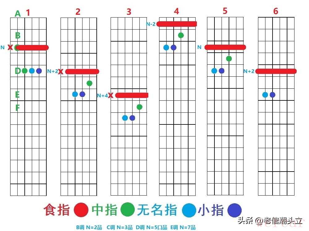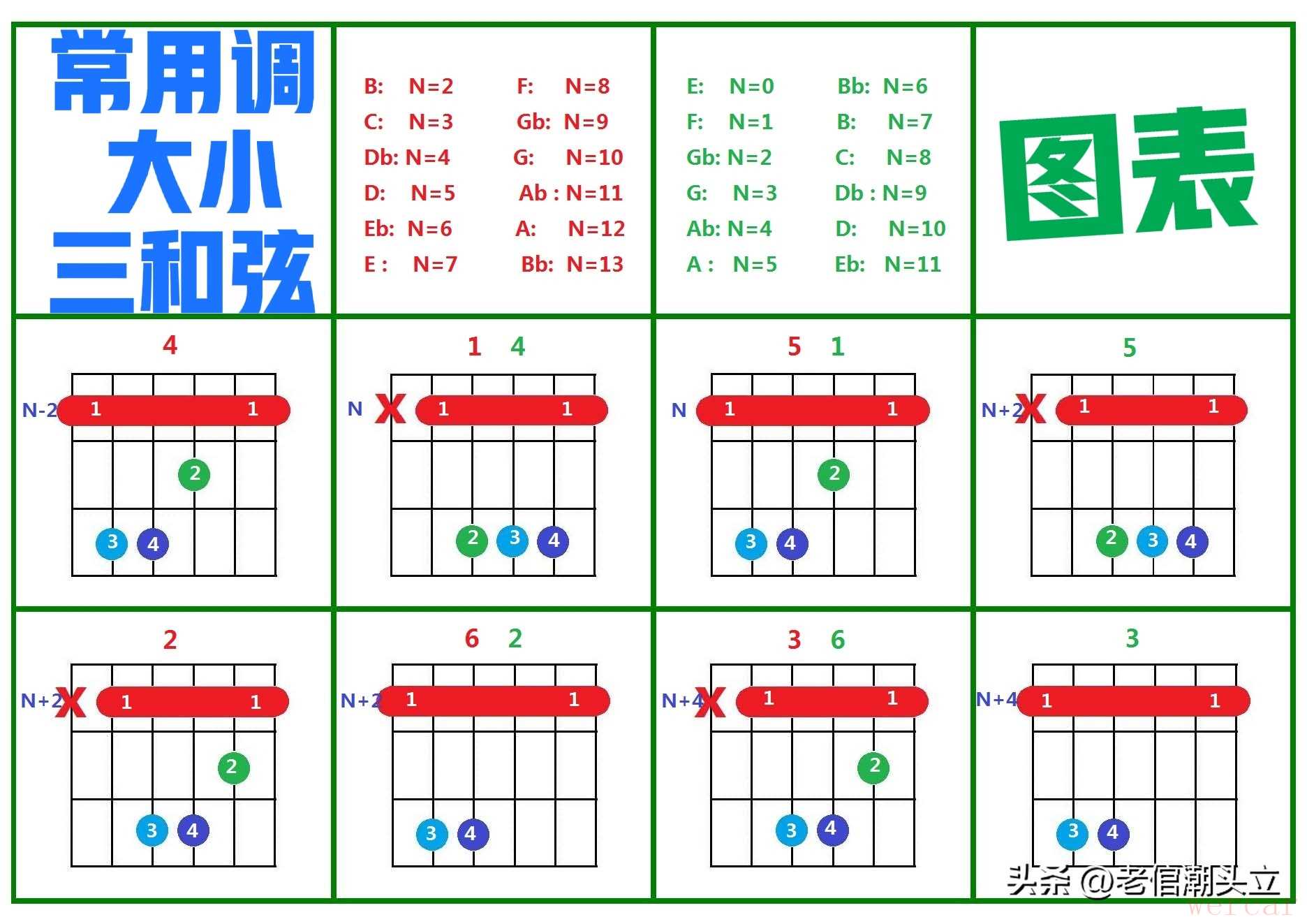 很多新手疑惑,为什么练会E、Em、A、Am这四个和弦,就能弹几十首歌?答案就在这里,它们是所有和弦的“源头”,其他和弦都是这四个手型平移出来的,根本不用额外记。下图中,是两套和弦,共四列,左边三列为一套(红字组)、右边三列为另一套(绿字组),表中如红字组C:N=3,表示C调,N=3,代表第三品,和弦图上面的数字代表该套和弦的顺音阶和弦级数123456,N+2就是3+2代表五品,N-2就是3-2代表1品,调不同,N值不同。