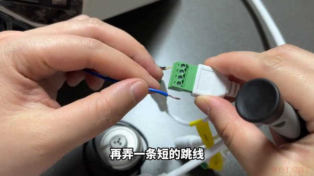拾音器带三条线,红色电源正极,黑色负极,黄色音频信号。这个摄像机自带反向供电,就不需额外再给拾音器增加电源适配器。红色的线接入反向供电的正极,黑色的线接入反向供电的负极,黄色的线接入音频输入IN口。再弄一条短的跳线,一端接入音频输入的G端子,一端接入反向供电的负极就可以了。