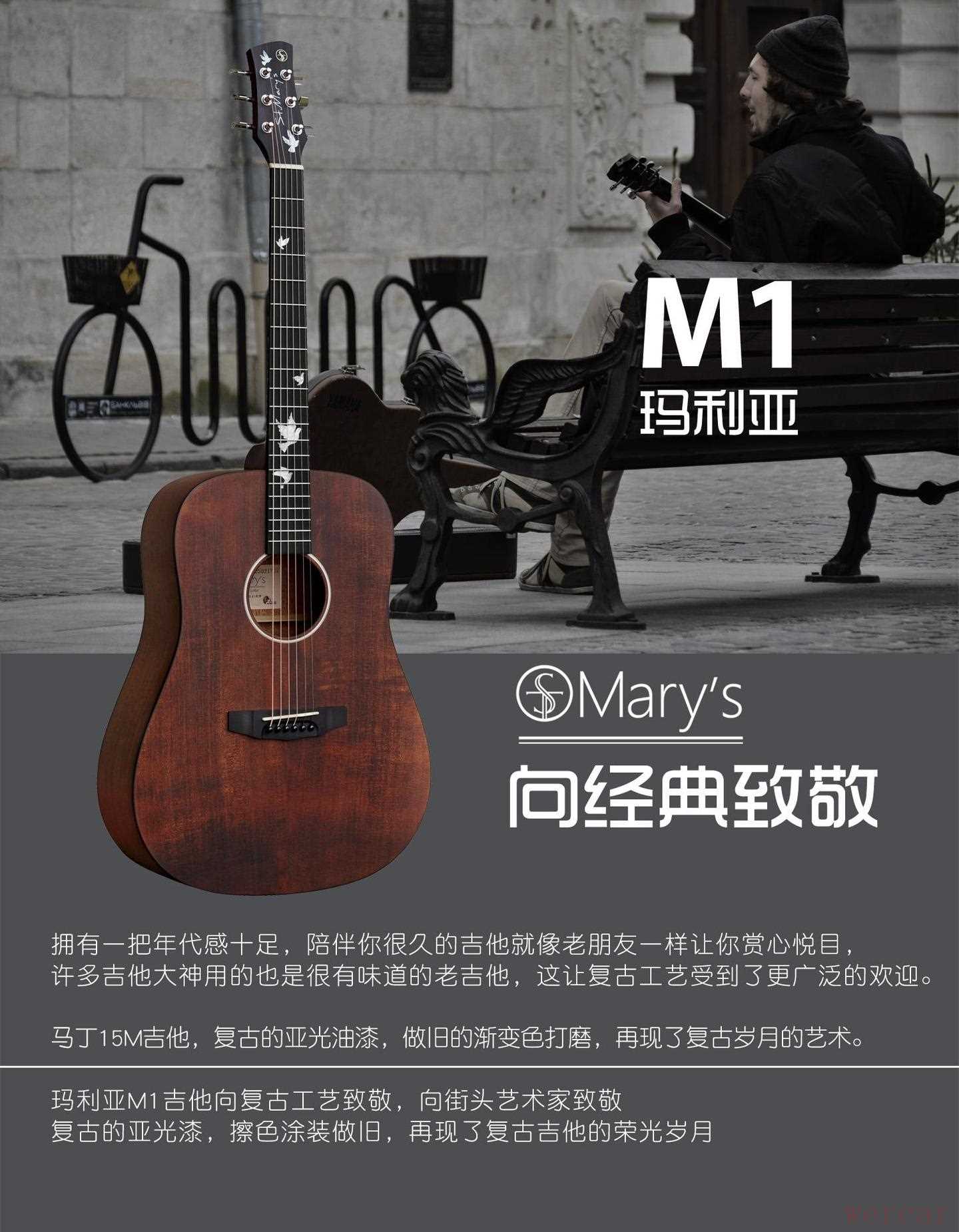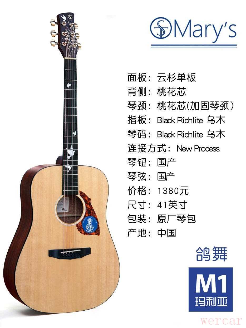 玛利亚M1单板民谣木吉他,正宗单板配置、专为新手优化的手感、稳定耐用的桃花芯木材质、省心的螺栓式接柄工艺、终身质保的售后,绝对是千元内新手入门单板吉他的首选。