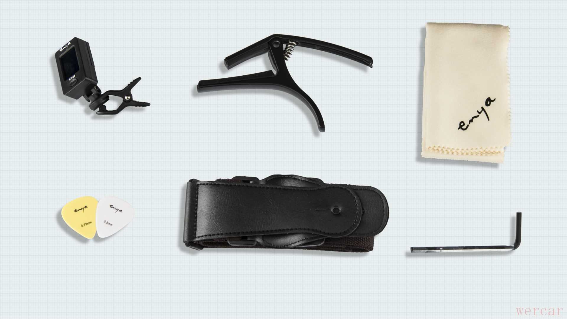 除了调音器、变调夹、擦琴布、拨片、背带、调节扳手等这些实用的配件,恩雅还赠送了一根音箱连接线,方便加振拾音器的使用。