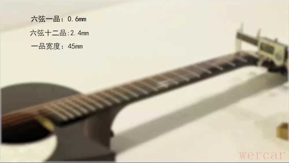 经过测量,X3的弦距,六弦1品为0.6mm左右,12品为2.4mm左右,手感轻柔,琴颈一品宽度为45mm,比常规的民谣吉他要宽两毫米,这点请大家注意。