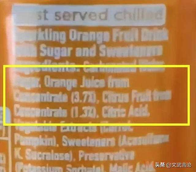 因为在英国版芬达的配料表上,浓缩橙汁的含量高达3.7%,还有大量不同的添加剂,与作为防腐剂的山梨酸钾。