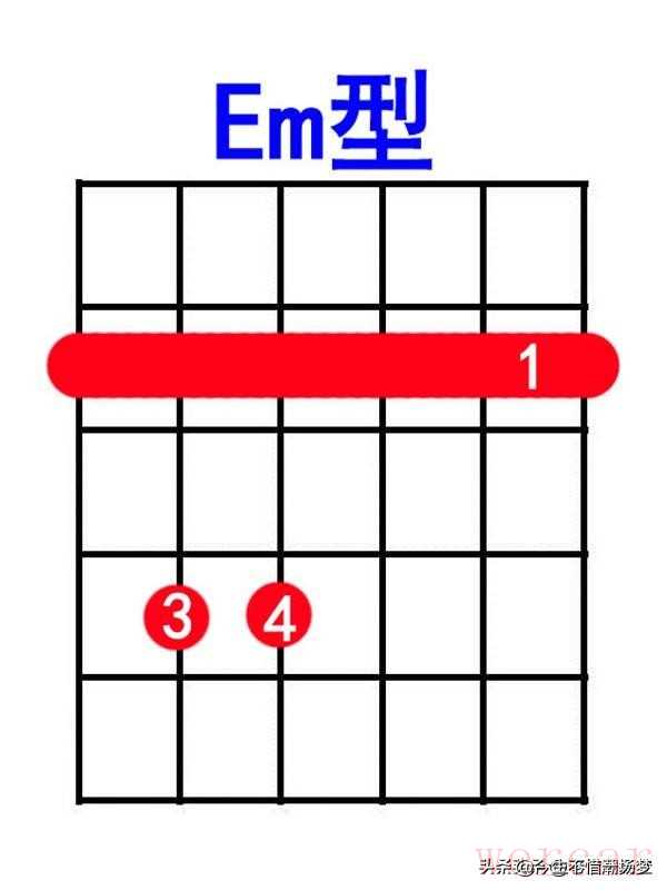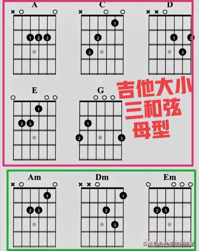 搞懂了音高排列,和弦这层窗户纸一捅就破,秘密就在于固定手型配合大横按的平移,咱们常按的那些基础和弦,其实就是最核心的“母手型”,先看那最常用的E型手型,根音扎在六弦上,空弦按出来是个E和弦,食指大横按往上一品横扫过去,瞬间变成了F和弦,整个手型纹丝不动,平移到三品,G和弦就出来了,品数对应音高,和弦名直接现身,根本无需死记,Em型手型也是同理,根音在六弦的大小三和弦,全靠这两个手型“打天下”。
