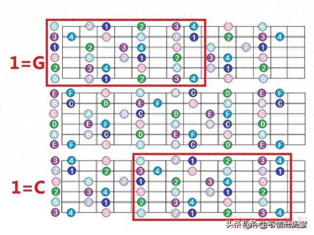 拿起吉他细看,六根弦空弦音从粗到细依次是E、A、D、G、B、E,这是所有和弦的“地基”,咱们以六弦为例实地操作一番,空弦是E音,按照十二平均律,每一品为一个半音,手指按住一品变成了F音,滑到三品是G音,五品是A音,七品是B音,八品是C音,十品是D音,走到十二品那个点,音高又回到了E,C大调音阶里那种“全全半全全全半”的关系,在指板上体现得明明白白。