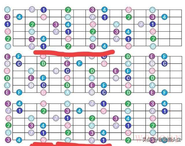 第二套是1234型,从六弦1(do)起步,走2、3、4音,适合E、F、G、A调,原理和上一套一样,只是起始音不同,熟悉指法就行。1