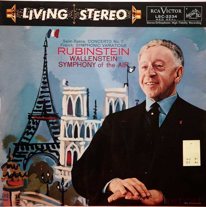 圣桑:《钢琴协奏曲第二号》,法朗克:《交响变奏曲》,鲁宾斯坦(钢琴),华伦斯坦指挥空中交响乐团,1958年出品,入榜编号为RCA LSC 2234,英国版本编号是 SB 2023。本唱片收录了两首19世纪充满浪漫气质的曲子,圣桑有名的第二号钢琴协奏曲,发挥他精细的艺术造诣,融合了音乐的形式与技术,加上高明的配器,音乐热情优美。鲁宾斯坦与华伦斯坦两位充满默契的配合,演出精致细腻,管弦乐配合地自然平衡,琴声清澈透亮,高雅的空间感,回响透着花音,清新的感受,非常舒畅贴心的录音!此片也是HP的榜单中被特别另加附标注“录音格外地自然且富有音乐性”的其中一张。
