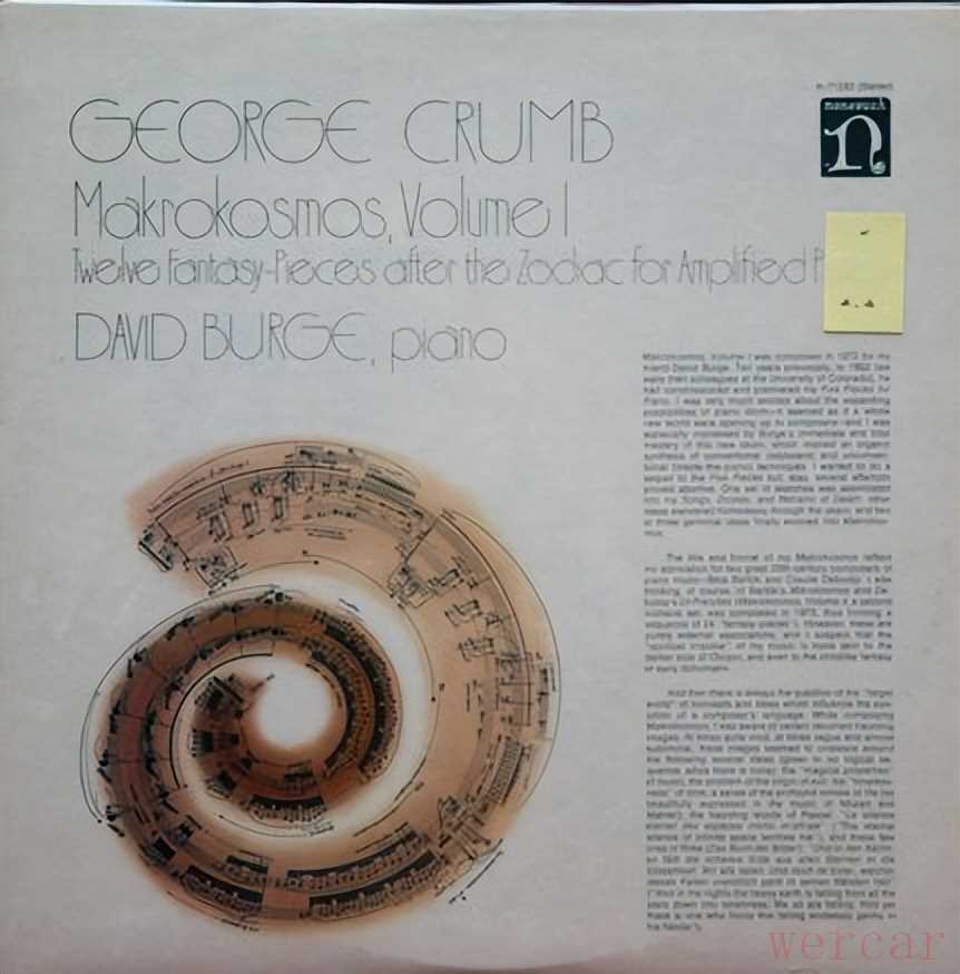 乔治·克拉姆《大宇宙》,第一卷(1972)。音乐制作由 Nickrenz 和 Aubort(Elite Recordings)小组负责录音由传奇工程师马克.奥博特负责,1974年出版。(Marc Aubort,从 1958 到 1965年是 Vanguard 唱片的总录音工程师,后来成立 Elite Recordings 与 Joanna Nickrenz 合作,采用极简方式,类似 Robert Fine 的录音哲学,帮 Nonesuch、Angel 以及 vox -Turnabout 等小规模公司录制了多张唱片,张张都是精品,值得推荐与收藏)。