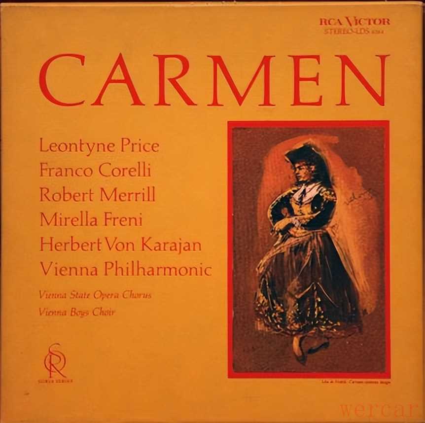 卡拉扬处理的非常精致,较为自由并带着活力与感性,非常注意舞台表现与气氛的张力对比,美国的黑人女歌手李奥汀·普莱丝以一种挑逗诱人、性感的音色来诠释卡门这个角色,柯莱里令人兴奋、刚健的唐·何塞,弗蕾妮唱出不平凡的米卡埃拉,再加上维也纳少年合唱团自然和谐的演出,歌声悠扬、管弦乐细腻迷人,堂音自然饱满,是值得收藏的录音。