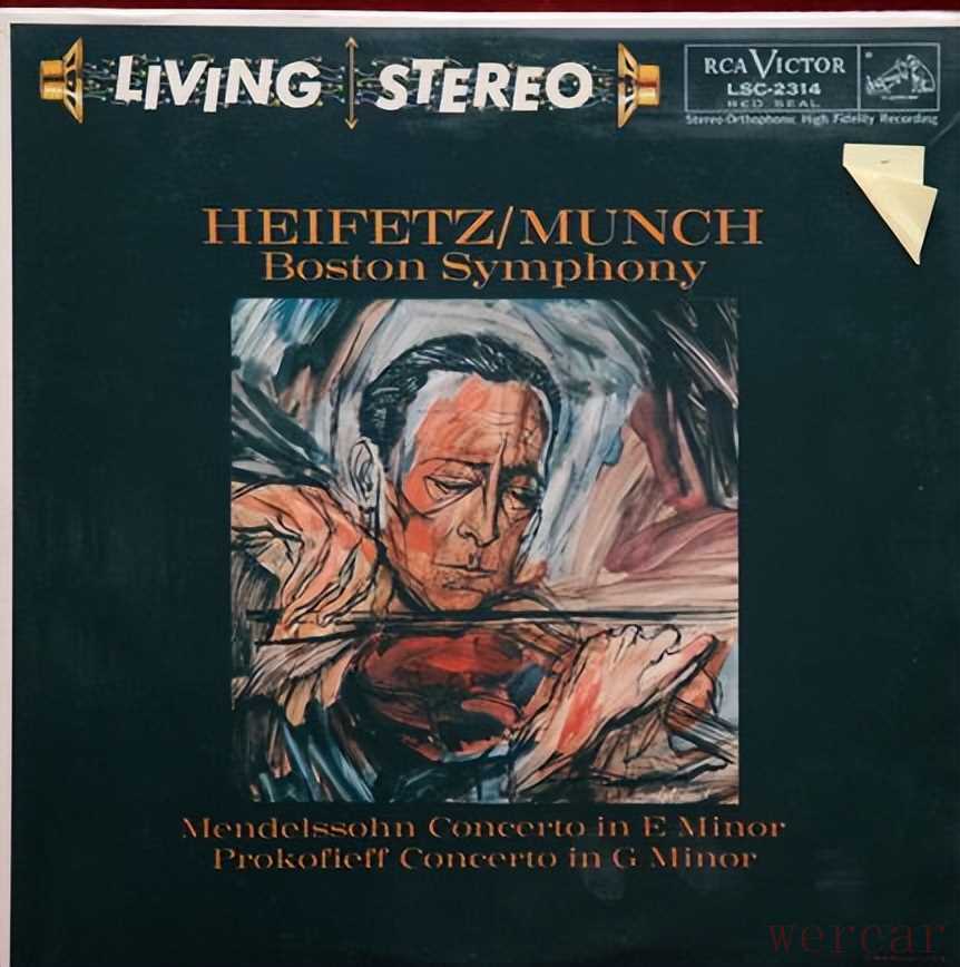门德尔松:《e 小调小提琴协奏曲》,普罗高菲夫:《g小调第二小提琴协奏曲》,海飞兹小提琴,明希指挥美国波士顿交响乐团。由 John Crawford 在波士顿管弦乐厅(BSH),1958年录制的,1959年出版。门德尔松的《e 小调小提琴协奏曲》作于 1844年,在海飞兹众多表演曲目中占有很特殊的地位,此曲他曾在 1949年时与毕勤(Thomas Beecham)合作录过。