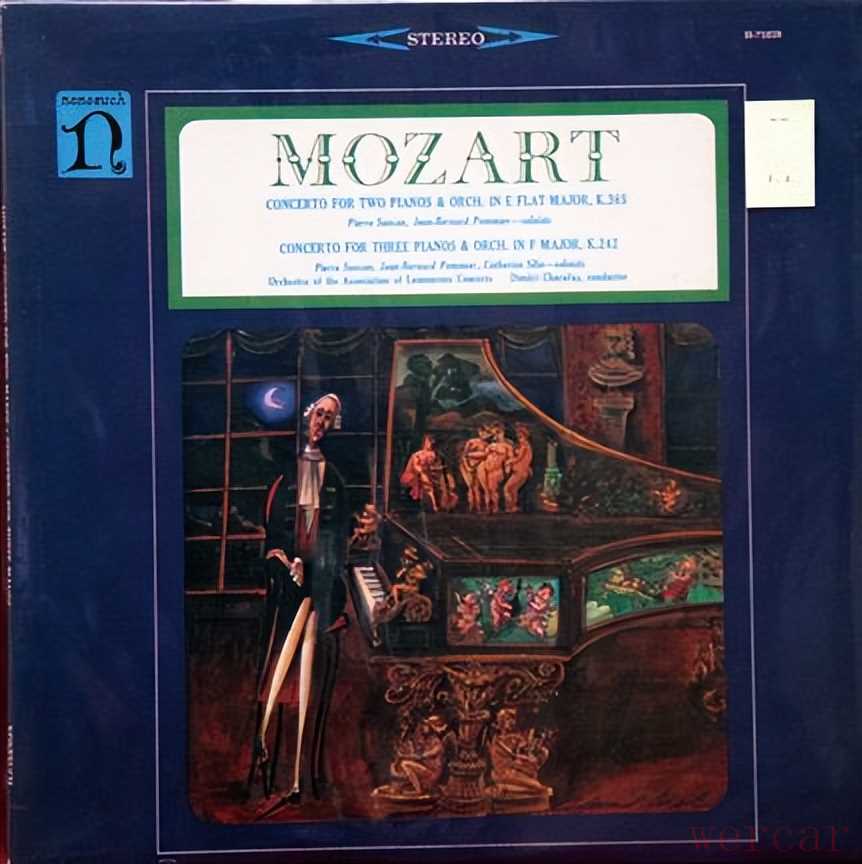 莫扎特:《双钢琴协奏曲,K 365》、《三架钢琴协奏曲 K 242》,Dimitri Chorofas 指挥拉穆卢管弦乐团。三位法国钢琴家:尚康(Sancan)、波米耶(Pommier)和希利(Silie)合作,原录音是法国 Club Francais Du Disque 公司在巴黎录制。这两首不常常听到的协奏曲,录制的相当甜美,钢琴的音像与乐团的音色层次清晰,似乎没有特别令人惊喜的地方,若音响解析力不好的话,还听不出双钢琴、三架钢琴与乐团的美妙之处,在封背后有一段给听众的提示,有关三架钢琴协奏曲的录音,要我们尽量拉开两个音箱的距离或坐近一点来聆听,以便得到较好的音效以及三部钢琴不同音色的表现。