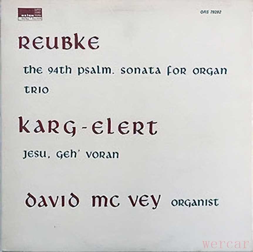 这张唱片收录了两位德国作曲家的管风琴作品,由David Mc Vey 演奏管风琴,ORION 1977年出版。由于本片士为大学相关院校提供教学参考,并未商业发行,HP住家曾遭祝融,收藏的唱片一部份损失,这张唱片再也找不回来,阳江世界发烧音响博物馆的收藏格外珍贵。C小调第94首诗篇奏鸣曲是Reubke根据诗篇地94首创作的管风琴独奏奏鸣曲,被认为是浪漫主义曲目中的巅峰之作。音乐本身受李斯特的幻想曲和赋格曲的启发,演奏时需要先进的踏板技术和对管风琴所有部门的巧妙利用。ARGO有一张同曲目的录音,可以弥补一些遗憾。