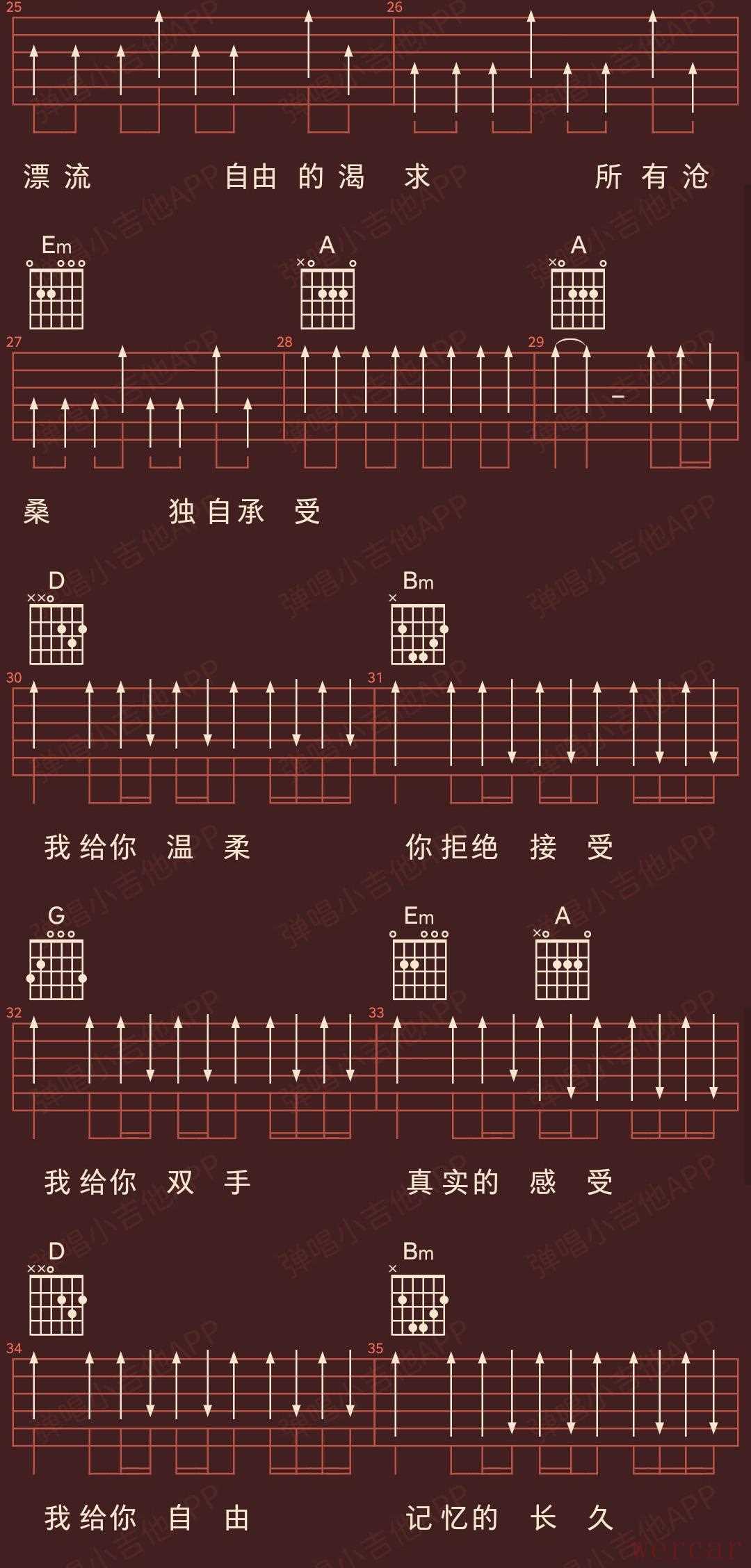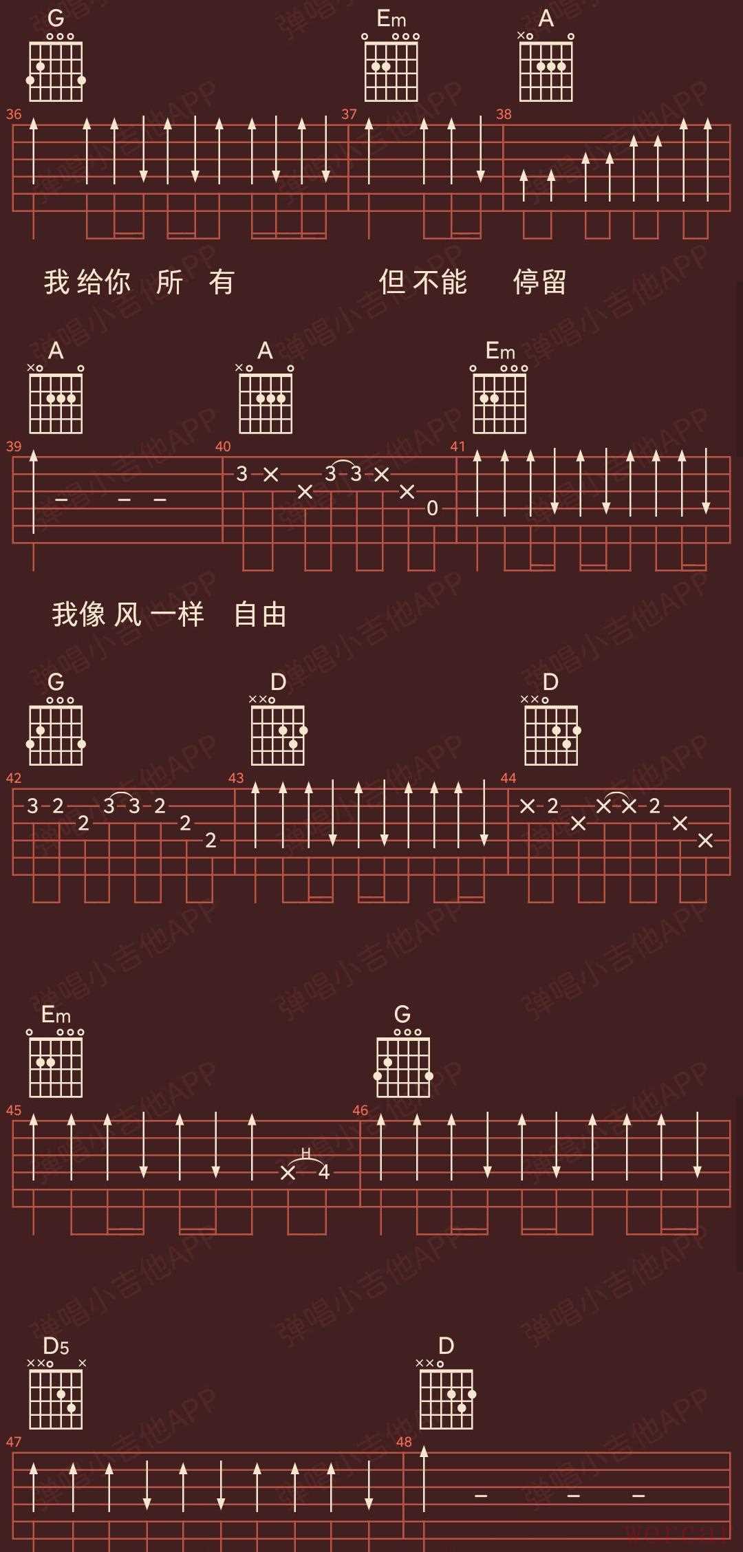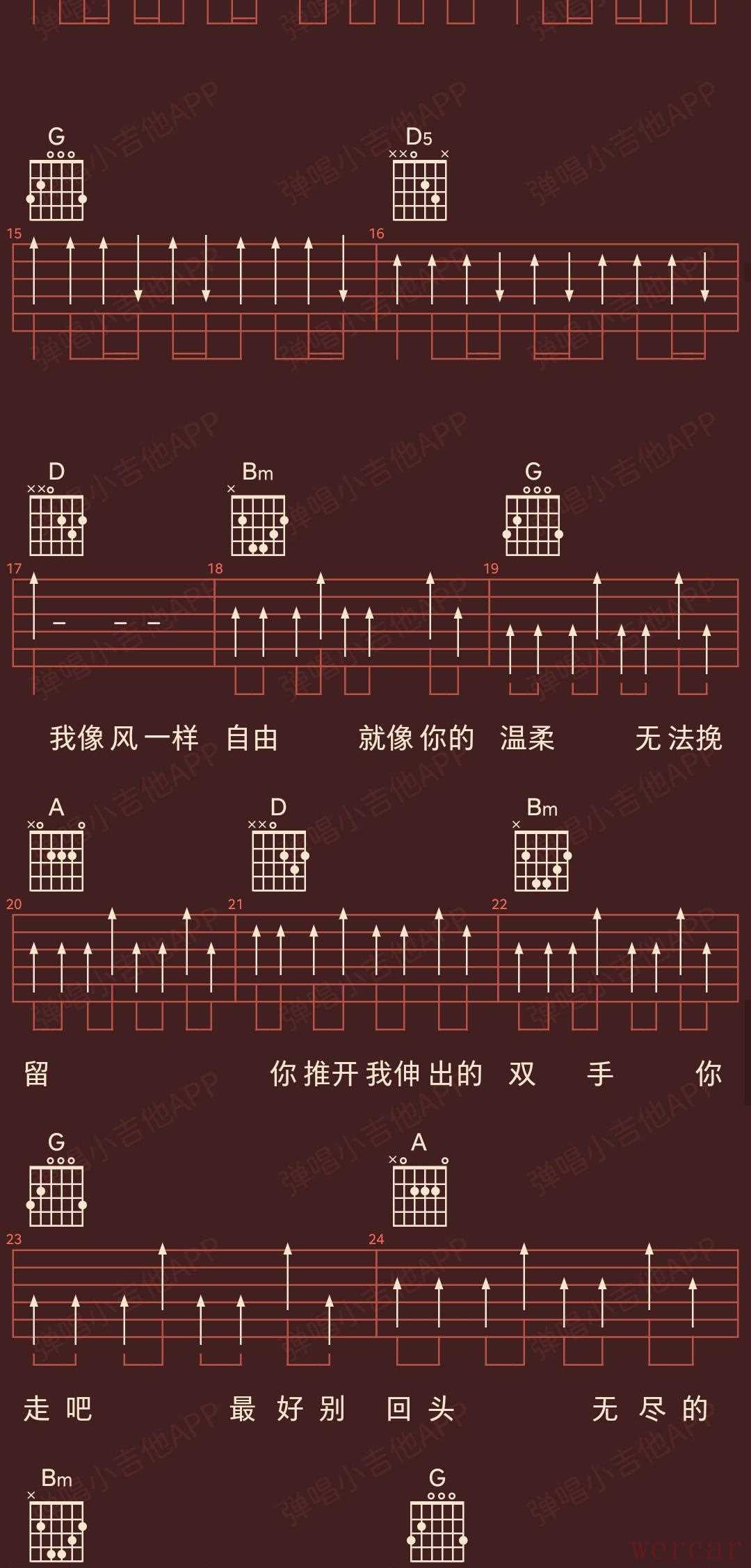 “我像风一样自由,就像你的温柔无法挽留,你推开我伸出的双手,你走吧最好别回头”。好啦,今天的分享就到这里,关注我,每天分享好听、简单上手的吉他谱。