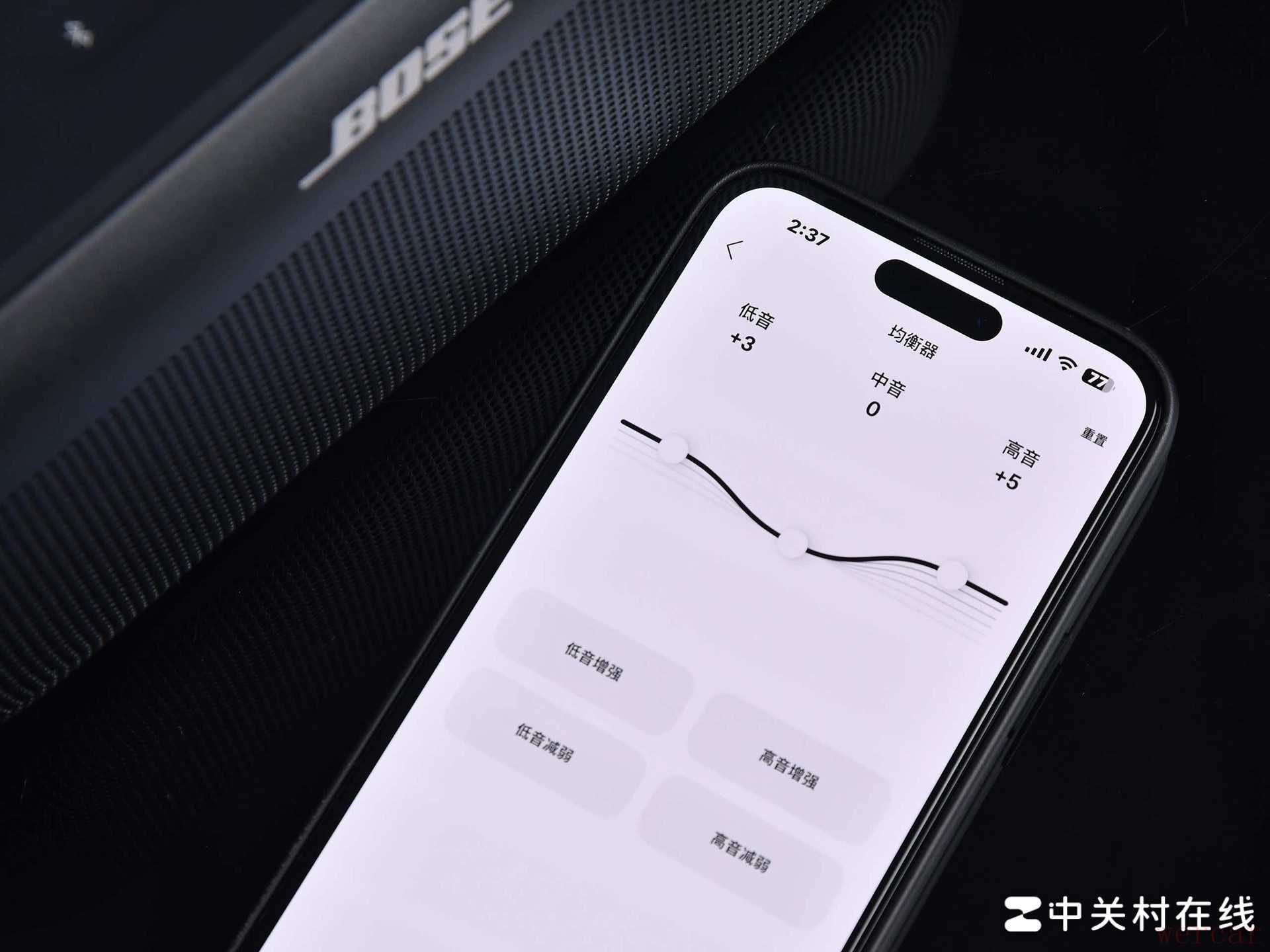 对了,我还可以通过Bose App查看当前电量、调节音量、调整三段式 EQ 等个性化选项。兼容性方面,不管是手机、平板还是笔记本电脑,只要有蓝牙都能快速连接到 SoundLink Plus 播放音乐。我注意到,这款音箱没有3.5mm有线音频接口,不过蓝牙早已是主流连接方式,日常使用影响不大。