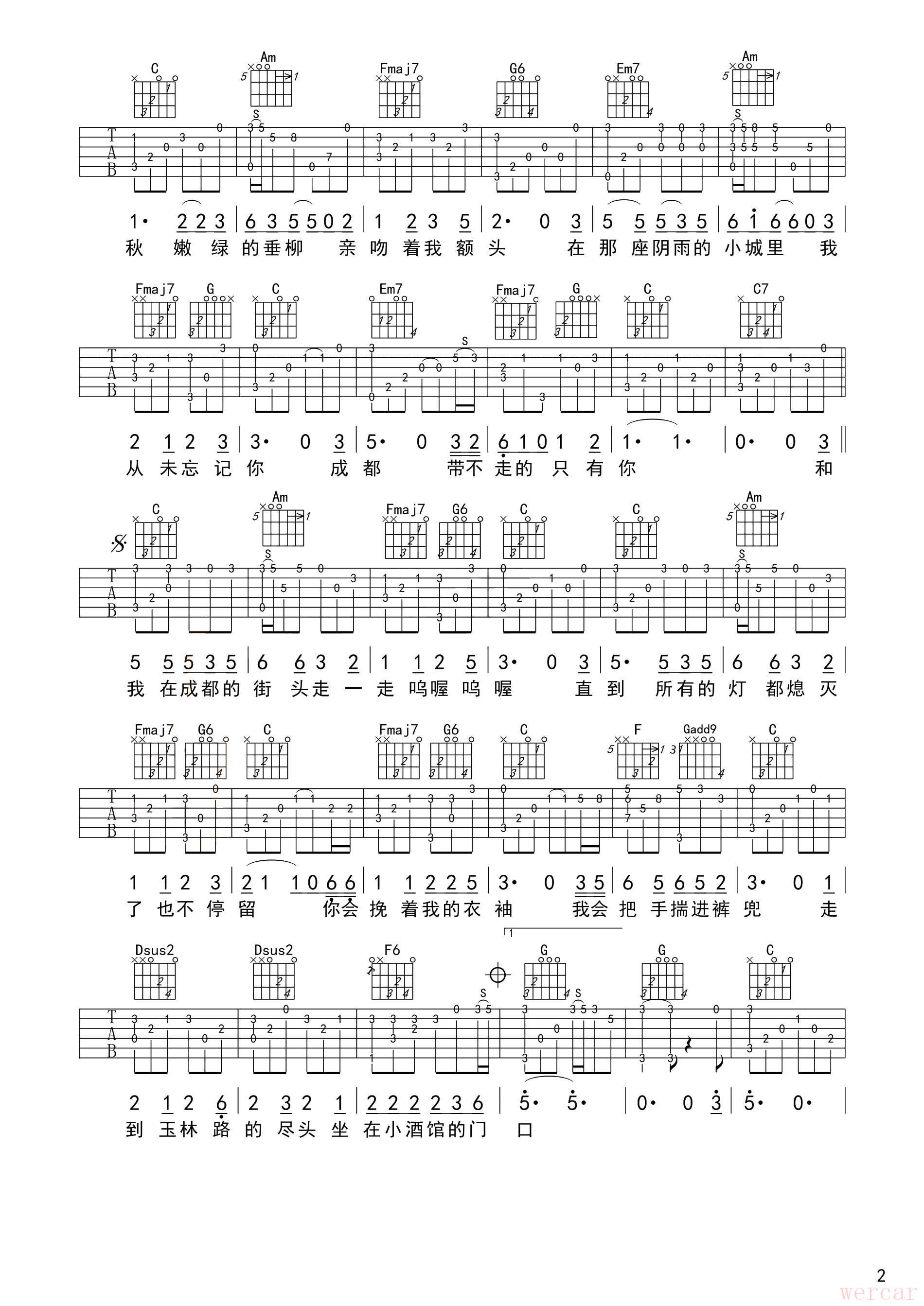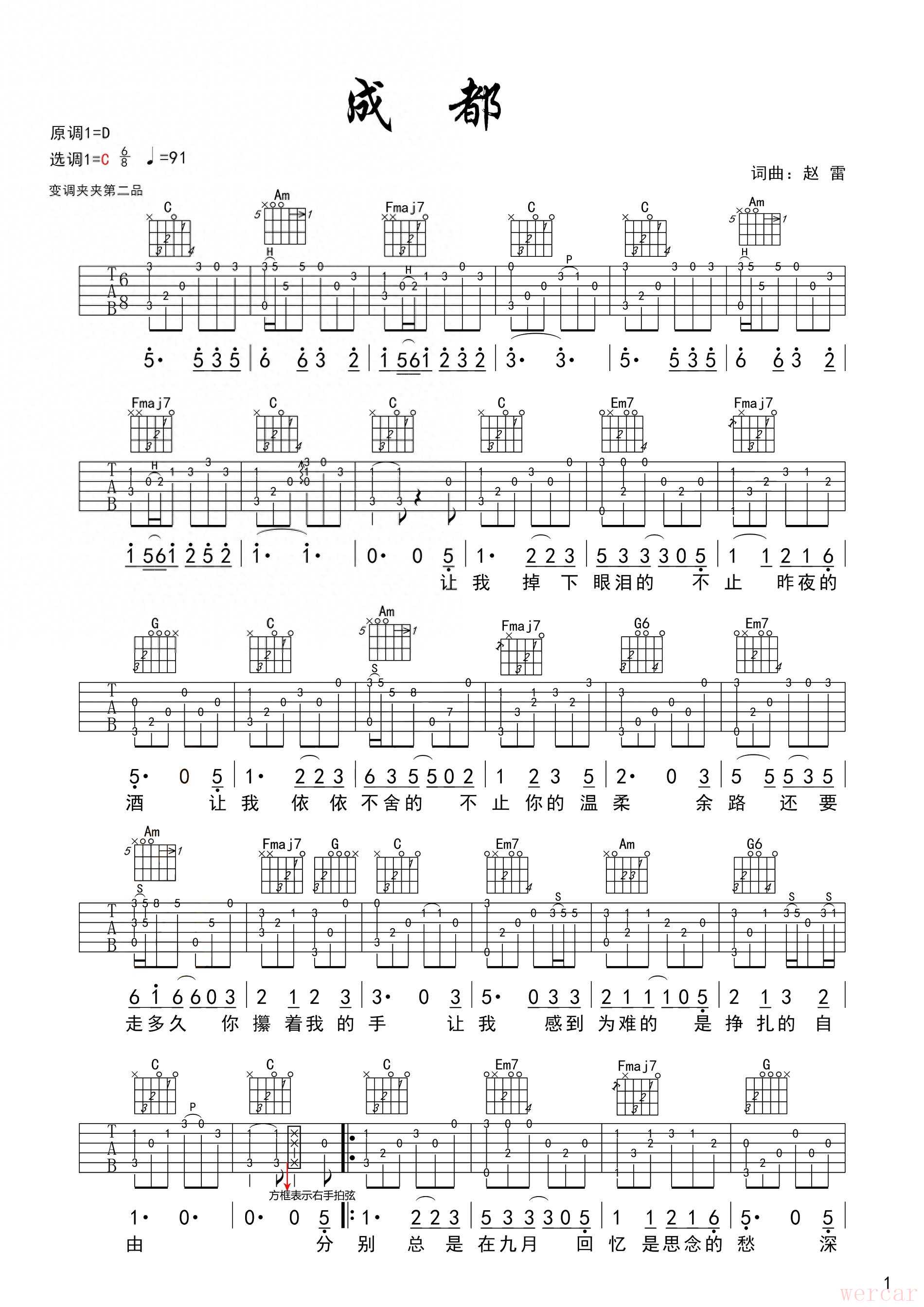 赵雷经典之作成都指弹吉他谱,弹奏浪漫旋律
