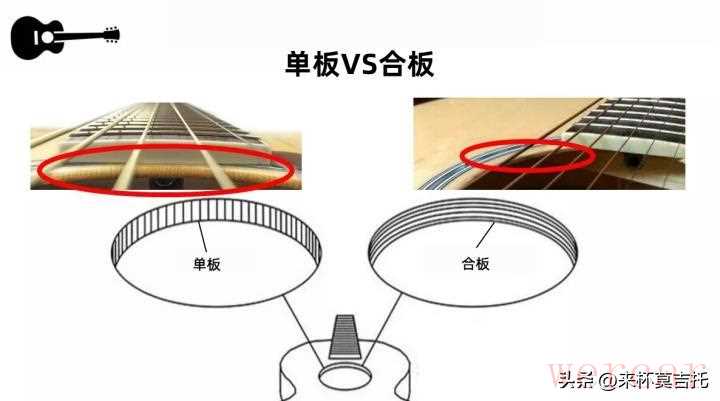 合板琴由于使用人工层压木材,在震动和共鸣上有很大局限,音色始终难尽人意,但它属于多层板胶合而成,结构上更稳定,所以不容易受温湿度影响。而单板吉他使用的天然实木,木质纤维方向都是统一的,这样更有利于声音震动和传导,于是才会有更好的有音色。但也因为其统一的木质纤维方向,也更容易在温湿度过大变化时随之膨胀或者开裂,所以需要更用心保养。