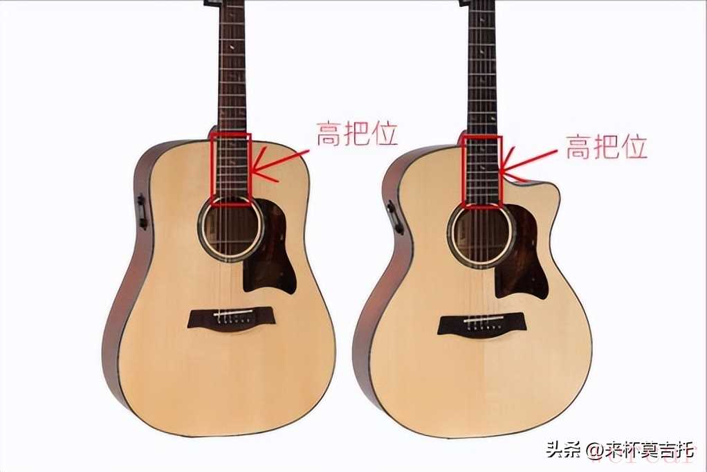 从外观上可以直观看到,两者之间最大区别就是缺角吉他在共鸣箱体上相比于圆角吉他有一个小缺口的设计,这是为了更好看吗还是其中有什么奥妙?其实都不是的,原因是因为圆角吉他在高把位上,也就是靠近音孔位置的品位,在演奏中受到一定限制,这才有了缺角吉他的设计,缺角吉他与圆角吉他功能上最主要的区别就是缺角吉他方便演奏高把位而圆角吉他在高把位的演奏相对困难。