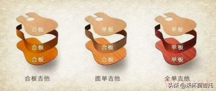 由上图可以看出吉他桶部是由面板、背板和侧板组成的。合板琴指的是面板和背侧板都同为人工合成板材制作而成,单板则是面板由实木板材,背侧板使用合板制作而成的,大家也称之为面单,全单琴则是面板和背侧板都是实木板材制作而成的。