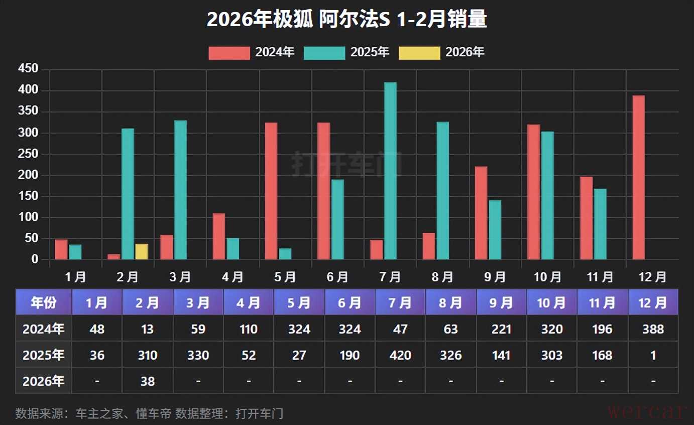 2月份,极狐阿尔法S销量为38辆,同比减少87.74%,1-2月份,累计销量为38辆,累计同比减少89.02%。